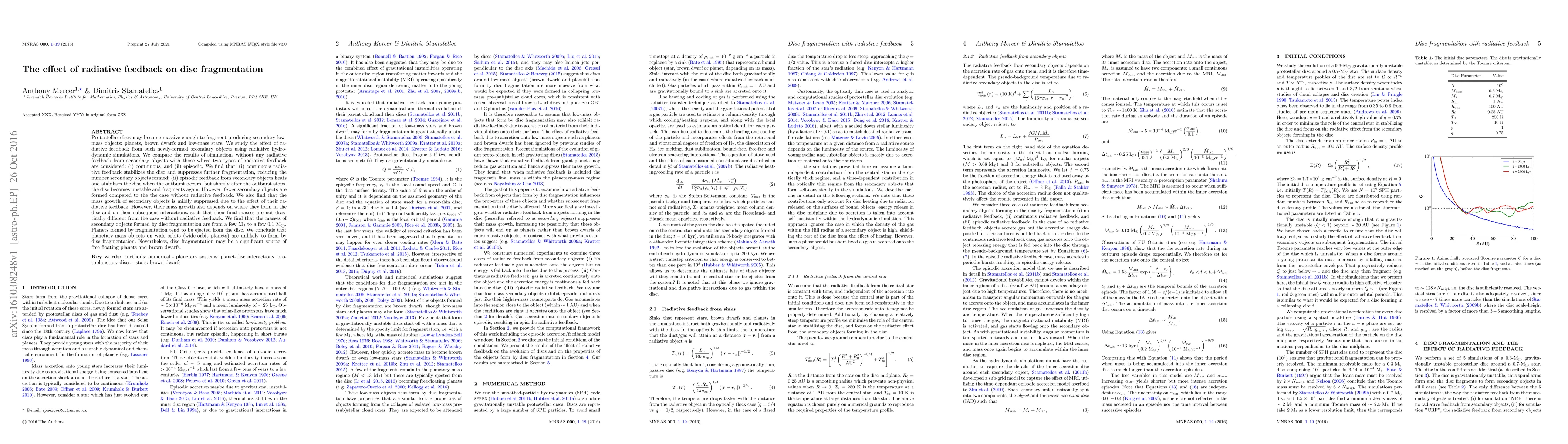 Protostellar discs may become massive enough to fragment producing secondary low-mass objects: planets, brown dwarfs and low-mass stars. We study the effect of radiative feedback from such newly-formed secondary objects using radiative hydrodynamic simulations. We compare the results of simulations without any radiative feedback from secondary objects with those where two types of radiative feedback are considered: (i) continuous, and (ii) episodic. We find that: (i) continuous radiative feedback stabilizes the disc and suppresses further fragmentation, reducing the number secondary objects formed; (ii) episodic feedback from secondary objects heats and stabilises the disc when the outburst occurs, but shortly after the outburst stops, the disc becomes unstable and fragments again. However, fewer secondary objects are formed compared to the the case without radiative feedback. We also find that the mass growth of secondary objects is mildly suppressed due to the effect of their radiative feedback. However, their mass growth also depends on where they form in the disc and on their subsequent interactions, such that their final masses are not drastically different from the case without radiative feedback. We find that the masses of secondary objects formed by disc fragmentation are from a few M$_{\rm J}$ to a few 0.1 M$_{\odot}$. Planets formed by fragmentation tend to be ejected from the disc. We conclude that planetary-mass objects on wide orbits (wide-orbit planets) are unlikely to form by disc fragmentation. Nevertheless, disc fragmentation may be a significant source of free-floating planets and brown dwarfs.