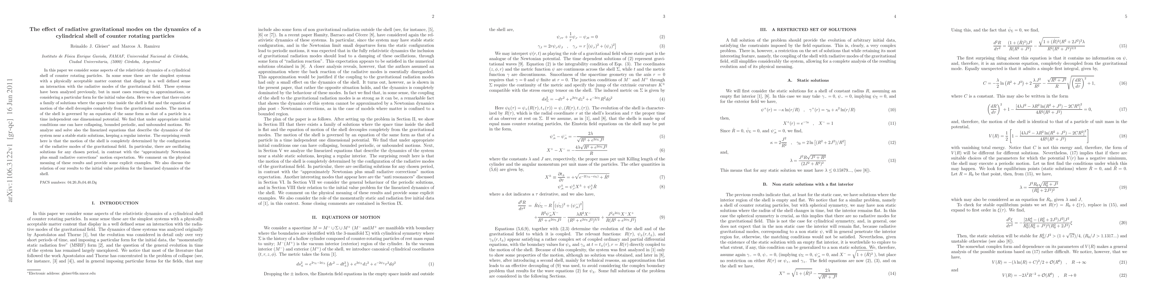 In this paper we consider some aspects of the relativistic dynamics of a cylindrical shell of counter rotating particles. In some sense these are the simplest systems with a physically acceptable matter content that display in a well defined sense an interaction with the radiative modes of the gravitational field. These systems have been analyzed previously, but in most cases resorting to approximations, or considering a particular form for the initial value data. Here we show that there exists a family of solutions where the space time inside the shell is flat and the equation of motion of the shell decouples completely from the gravitational modes. The motion of the shell is governed by an equation of the same form as that of a particle in a time independent one dimensional potential. We find that under appropriate initial conditions one can have collapsing, bounded periodic, and unbounded motions. We analyze and solve also the linearized equations that describe the dynamics of the system near a stable static solutions, keeping a regular interior. The surprising result here is that the motion of the shell is completely determined by the configuration of the radiative modes of the gravitational field. In particular, there are oscillating solutions for any chosen period, in contrast with the "approximately Newtonian plus small radiative corrections" motion expectation. We comment on the physical meaning of these results and provide some explicit examples. We also discuss the relation of our results to the initial value problem for the linearized dynamics of the shell.