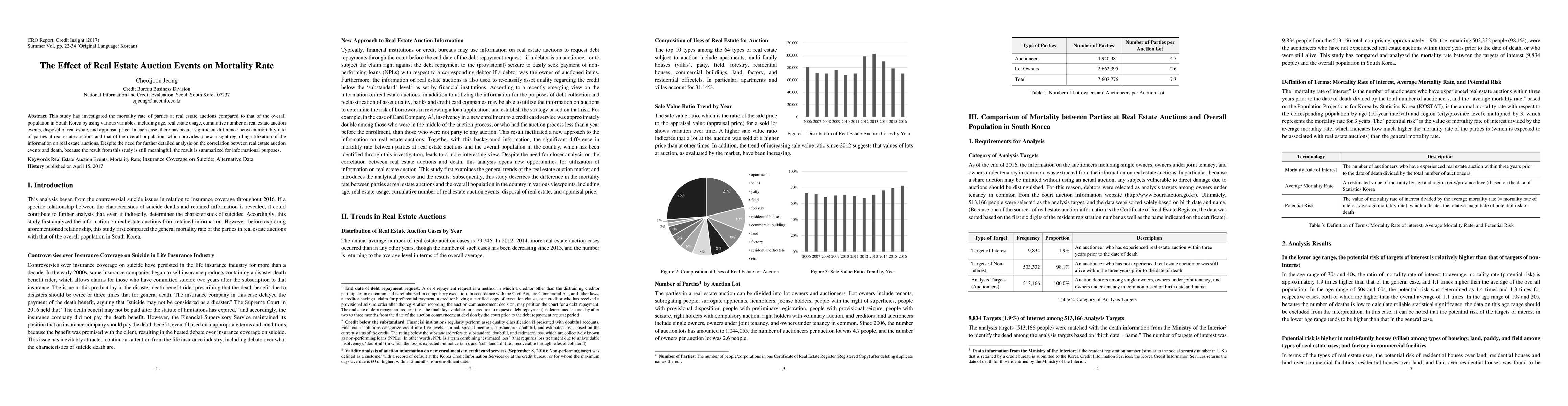 This study has investigated the mortality rate of parties at real estate auctions compared to that of the overall population in South Korea by using various variables, including age, real estate usage, cumulative number of real estate auction events, disposal of real estate, and appraisal price. In each case, there has been a significant difference between mortality rate of parties at real estate auctions and that of the overall population, which provides a new insight regarding utilization of the information on real estate auctions. Despite the need for further detailed analysis on the correlation between real estate auction events and death, because the result from this study is still meaningful, the result is summarized for informational purposes.