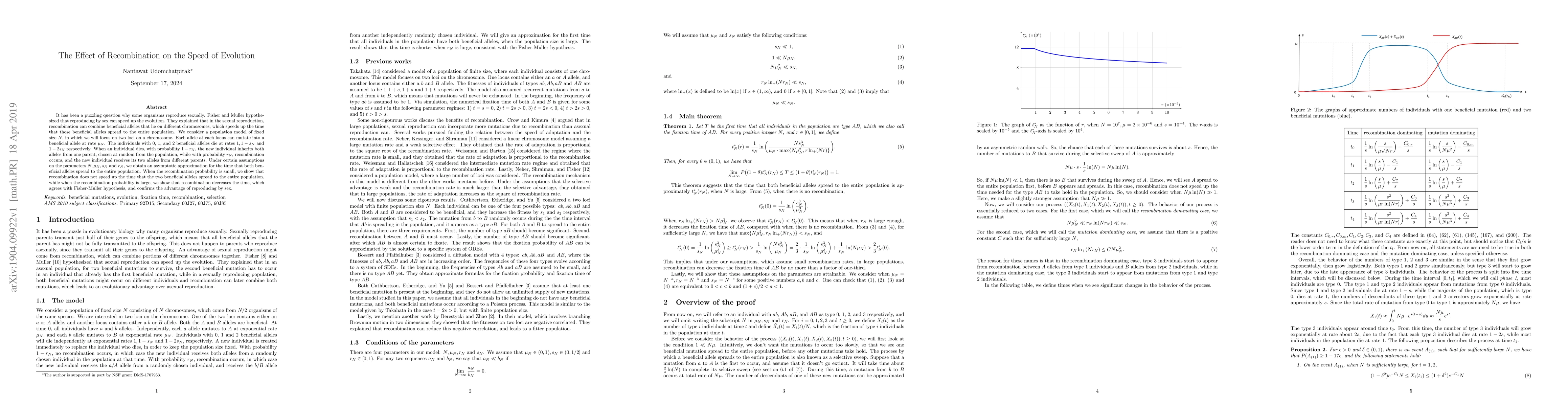 It has been a puzzling question why some organisms reproduce sexually. Fisher and Muller hypothesized that reproducing by sex can speed up the evolution. They explained that in the sexual reproduction, recombination can combine beneficial alleles that lie on different chromosomes, which speeds up the time that those beneficial alleles spread to the entire population. We consider a population model of fixed size $N$, in which we will focus on two loci on a chromosome. Each allele at each locus can mutate into a beneficial allele at rate $\mu_N$. The individuals with 0, 1, and 2 beneficial alleles die at rates $1, 1-s_N$ and $1-2s_N$ respectively. When an individual dies, with probability $1-r_N$, the new individual inherits both alleles from one parent, chosen at random from the population, while with probability $r_N$, recombination occurs, and the new individual receives its two alleles from different parents. Under certain assumptions on the parameters $N, \mu_N, s_N$ and $r_N$, we obtain an asymptotic approximation for the time that both beneficial alleles spread to the entire population. When the recombination probability is small, we show that recombination does not speed up the time that the two beneficial alleles spread to the entire population, while when the recombination probability is large, we show that recombination decreases the time, which agrees with Fisher-Muller hypothesis, and confirms the advantage of reproducing by sex.