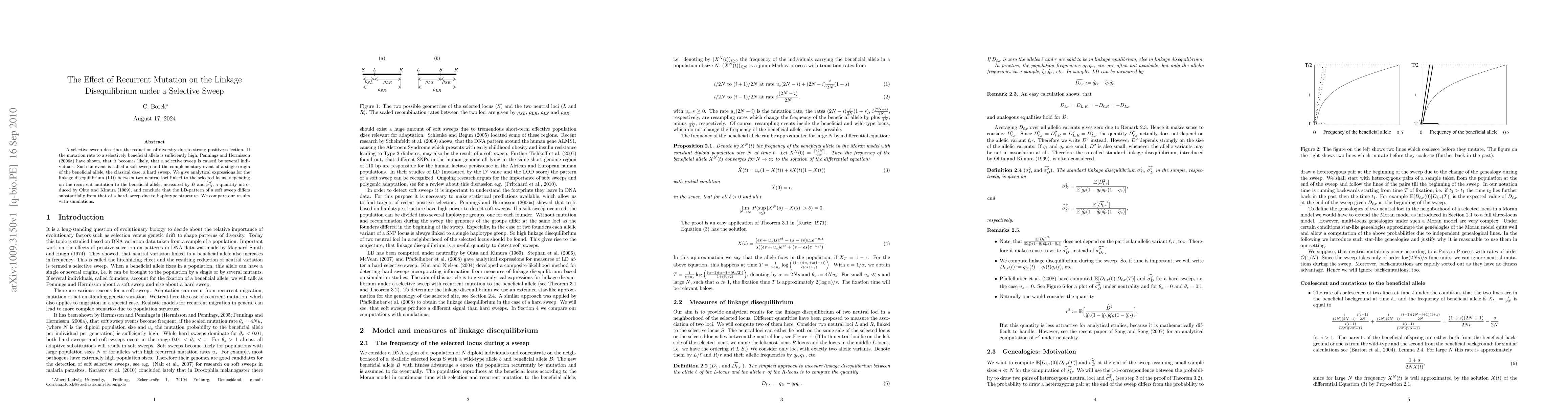 This paper investigates how recurrent mutations influence linkage disequilibrium (LD) patterns during selective sweeps, distinguishing between soft sweeps (multiple origins of beneficial alleles) and hard sweeps (single origin). Analytical expressions are provided for LD between neutral loci linked to the selected locus, showing that soft sweeps result in different LD patterns compared to hard sweeps due to differences in haplotype structure.