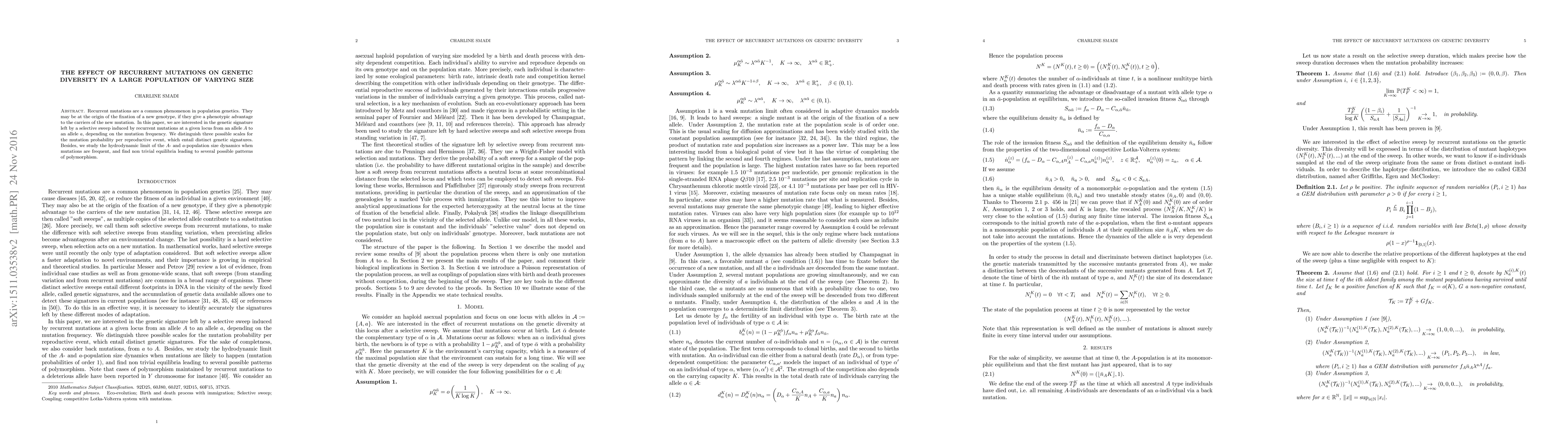 This paper investigates the genetic impact of recurrent mutations on genetic diversity in populations of varying sizes, focusing on selective sweeps from allele A to allele a. It identifies distinct genetic signatures based on different mutation frequencies and explores the population dynamics in the hydrodynamic limit, revealing complex patterns of polymorphism.