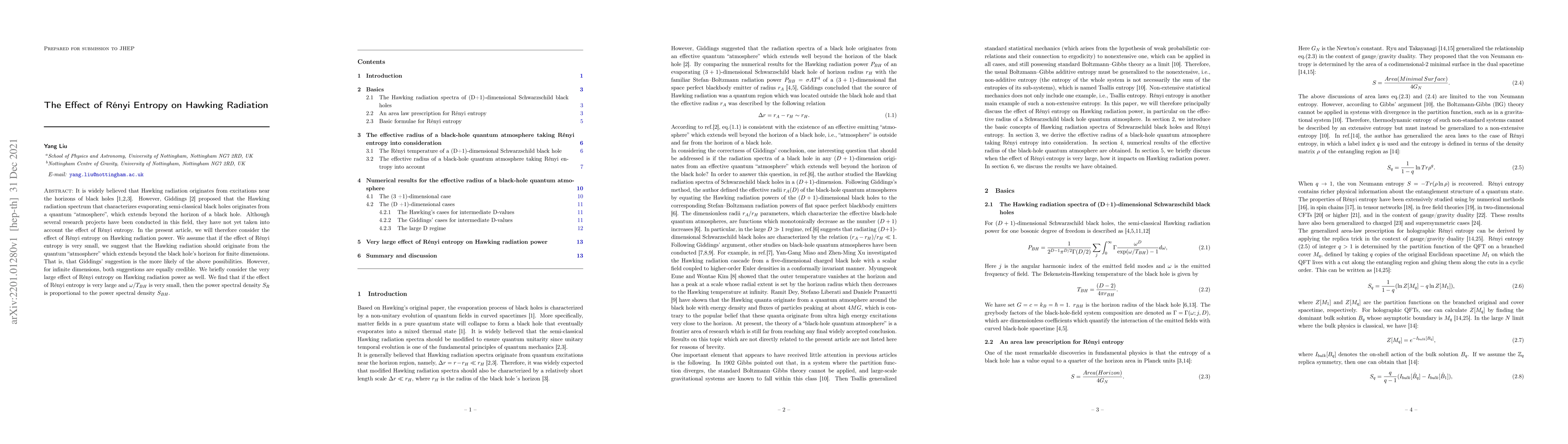 This paper explores the influence of R\'enyi entropy on Hawking radiation, suggesting that for finite dimensions, Hawking radiation likely originates from a quantum atmosphere beyond the black hole's horizon, while for infinite dimensions, both near-horizon and extended atmosphere origins remain plausible. It concludes that large R\'enyi entropy effects can proportionally affect the power spectral density of Hawking radiation.