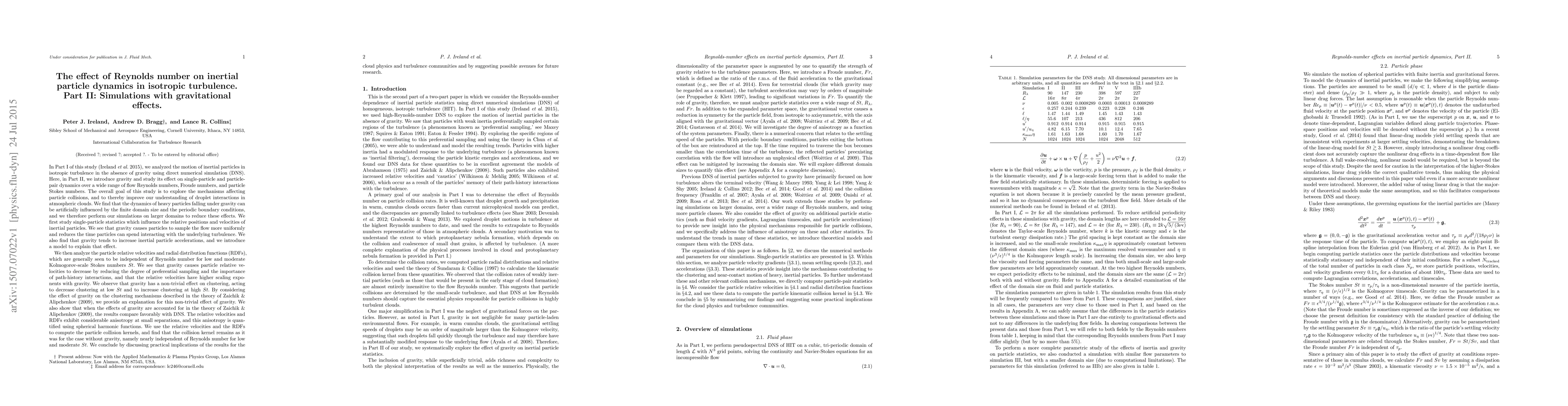 In Part I of this study, we analyzed the motion of inertial particles in isotropic turbulence in the absence of gravity using direct numerical simulation (DNS). Here, in Part II, we introduce gravity and study its effect over a wide range of flow Reynolds numbers, Froude numbers, and particle Stokes numbers. We see that gravity causes particles to sample the flow more uniformly and reduces the time particles can spend interacting with the underlying turbulence. We also find that gravity tends to increase inertial particle accelerations, and we introduce a model to explain that effect. We then analyze the particle relative velocities and radial distribution functions (RDFs), which are generally seen to be independent of Reynolds number for low and moderate Kolmogorov-scale Stokes numbers $St$. We see that gravity causes particle relative velocities to decrease, and that the relative velocities have higher scaling exponents with gravity. We observe that gravity has a non-trivial effect on clustering, acting to decrease clustering at low $St$ and to increase clustering at high $St$. By considering the effect of gravity on the clustering mechanisms described in the theory of Zaichik & Alipchenkov (New J. Phys., 11:103018, 2009), we provide an explanation for this non-trivial effect of gravity. We also show that when the effects of gravity are accounted for in the theory of Zaichik & Alipchenkov, the results compare favorably with DNS. The relative velocities and RDFs exhibit considerable anisotropy at small separations, and this anisotropy is quantified using spherical harmonic functions. We use the relative velocities and the RDFs to compute the particle collision kernels, and find that the collision kernel remains as it was for the case without gravity, namely nearly independent of Reynolds number for low and moderate $St$.