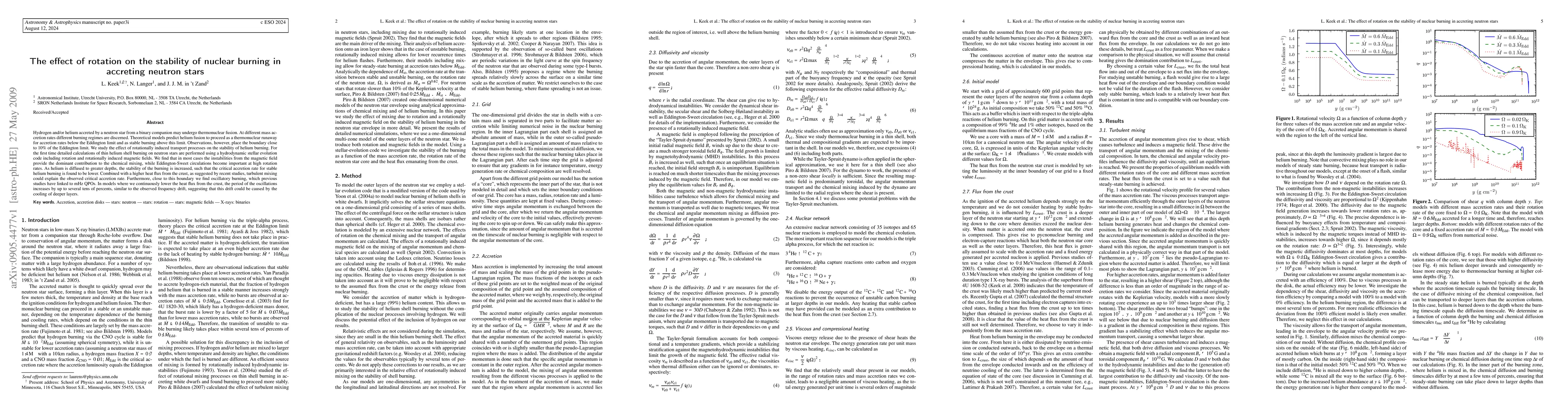 Hydrogen and/or helium accreted by a neutron star from a binary companion may undergo thermonuclear fusion. At different mass accretion rates different burning regimes are discerned. Theoretical models predict helium fusion to proceed as a thermonuclear runaway for accretion rates below the Eddington limit and as stable burning above this limit. Observations, however, place the boundary close to 10% of the Eddington limit. We study the effect of rotationally induced transport processes on the stability of helium burning. For the first time detailed calculations of thin helium shell burning on neutron stars are performed using a hydrodynamic stellar evolution code including rotation and rotationally induced magnetic fields. We find that in most cases the instabilities from the magnetic field provide the dominant contribution to the chemical mixing, while Eddington-Sweet circulations become important at high rotation rates. As helium is diffused to greater depths, the stability of the burning is increased, such that the critical accretion rate for stable helium burning is found to be lower. Combined with a higher heat flux from the crust, as suggested by recent studies, turbulent mixing could explain the observed critical accretion rate. Furthermore, close to this boundary we find oscillatory burning, which previous studies have linked to mHz QPOs. In models where we continuously lower the heat flux from the crust, the period of the oscillations increases by up to several tens of percents, similar to the observed frequency drift, suggesting that this drift could be caused by the cooling of deeper layers.