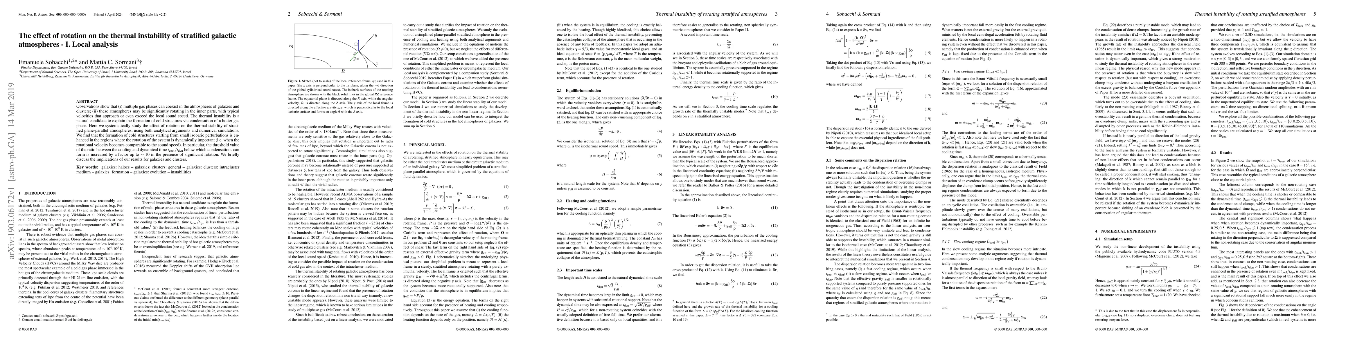 This study explores how rotation impacts the formation of cold structures from hotter gas in galaxy and cluster atmospheres. Using analytical models and simulations, the research reveals that rotation, particularly when comparable to sound speed, enhances thermal instability, raising the threshold for condensation formation by up to 10 times. The findings suggest significant implications for understanding the development of cold gas structures in rotating galactic and cluster atmospheres.