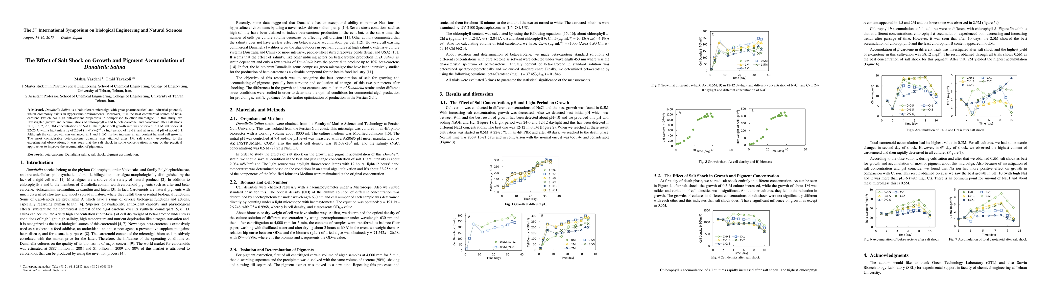 Dunaliella Salina is a halotolerant microalga with great pharmaceutical and industrial potential, which commonly exists in hypersaline environments. Moreover, it is the best commercial source of beta-carotene (which has high anti-oxidant properties) in comparison to other microalgae. In this study, we investigated growth and accumulations of chlorophyll a and b, beta-carotene, and carotenoid after salt shock in 1, 1.5, 2, 2.5, 3 M concentrations of NaCl. The highest cell growth rate was observed in 1 M salt shock at 22-25 centigrade with a light intensity of 2.084 (mW.cm)^(-2), a light period of 12-12, and at an initial pH of about 7.1. Although the cell growth was enhanced in 1 and 1.5M, further increase in salt content harmed cell growth. The most considerable beta-carotene quantity was attained after 1M salt shock. According to the experimental observations, it was seen that the salt shock in some concentrations is one of the practical approaches to improve the accumulation of pigments. Keywords: beta-carotene, Dunaliella salina, salt shock, pigment accumulation.
