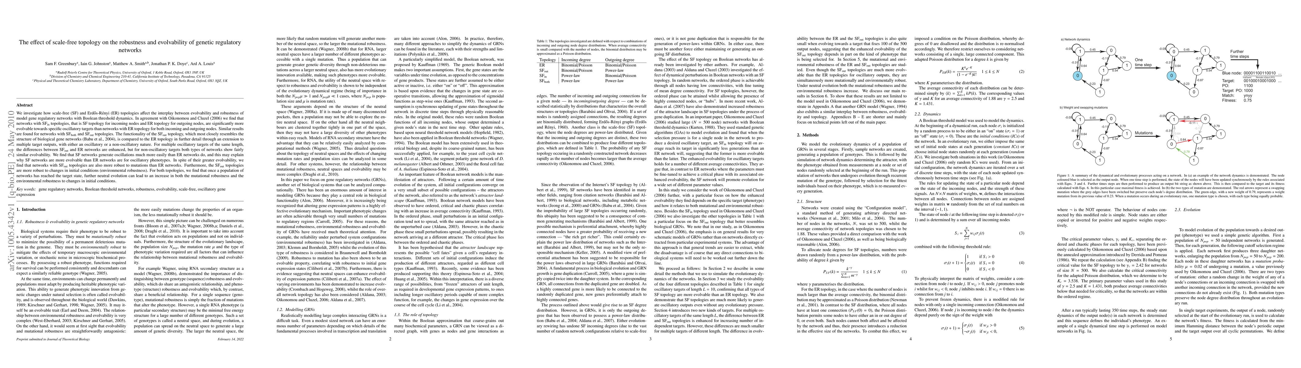 This paper examines the impact of scale-free (SF) versus Erdos-Renyi (ER) topologies on the robustness and evolvability of genetic regulatory networks. It finds that SF topologies, especially SFout, enhance evolvability towards oscillatory targets compared to ER networks, while also being more robust to mutations and environmental changes.