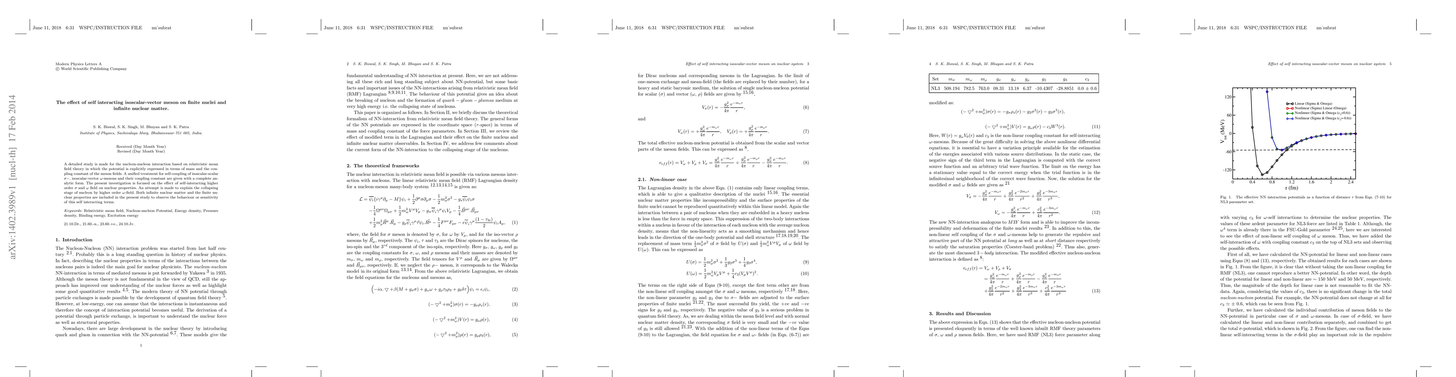 A detailed study is made for the nucleon-nucleon interaction based on relativistic mean field theory in which the potential is explicitly expressed in terms of mass and the coupling constant of the meson fields. A unified treatment for self-coupling of isoscalar-scalar $\sigma-$, isoscalar-vector $\omega$-mesons and their coupling constant are given with a complete analytic form. The present investigation is focused on the effect of self-interacting higher order $\sigma$ and $\omega$ field on nuclear properties. An attempt is made to explain the collapsing stage of nucleon by higher order $\omega$-field. Both infinite nuclear matter and the finite nuclear properties are included in the present study to observe the behaviour or sensitivity of this self interacting terms.