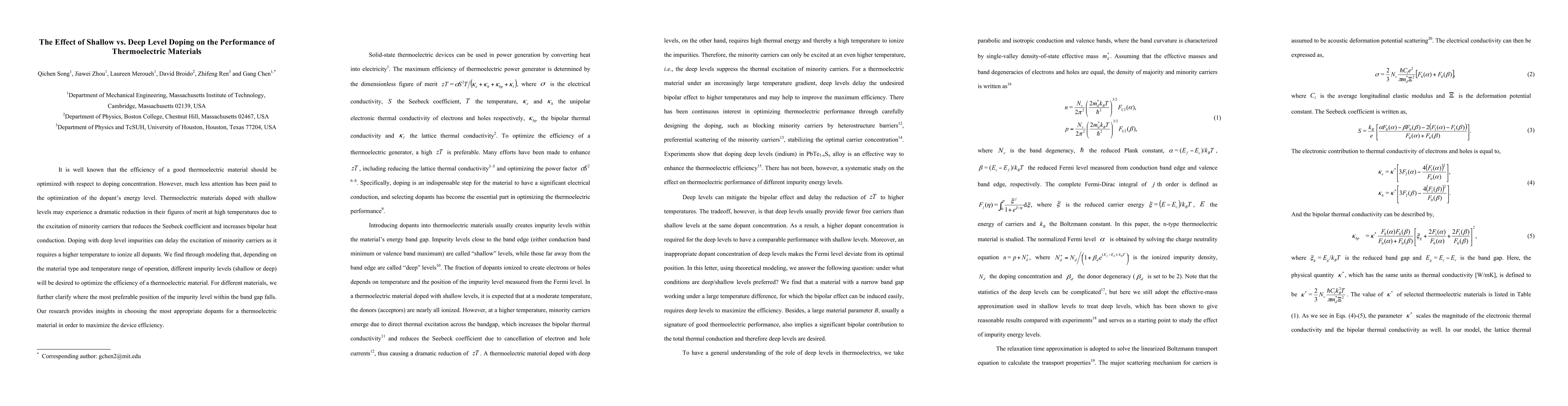 This paper investigates the impact of shallow vs. deep level doping on thermoelectric material performance, finding that shallow doping can reduce efficiency at high temperatures due to minority carrier excitation, while deep doping delays this effect. The study concludes that the optimal doping level depends on material type and operating temperature, providing guidelines for selecting dopants to maximize efficiency.