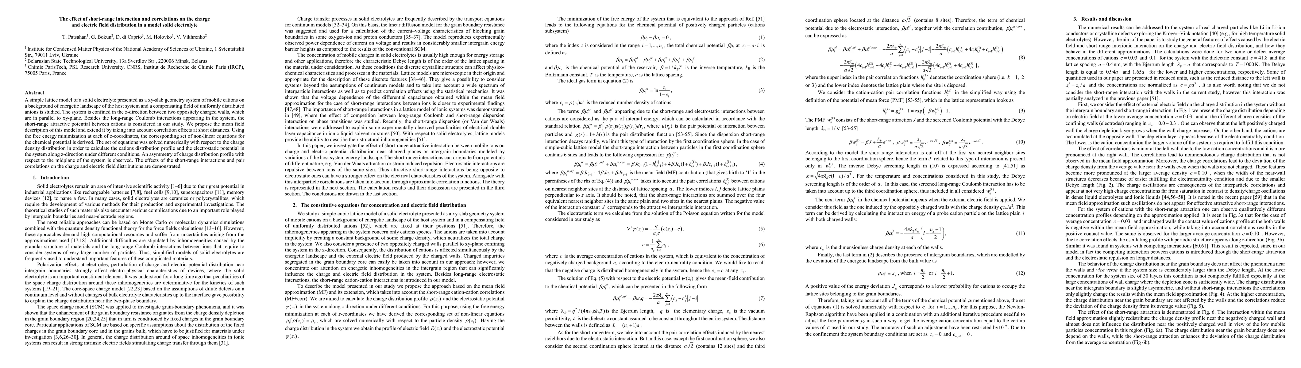 This research investigates a simple lattice model of a solid electrolyte, focusing on the influence of short-range interactions and correlations on the charge and electric field distribution in a xy-slab geometry system. It employs a mean field approach with numerical solutions to reveal asymmetric charge distribution and the impact of these interactions on the system.