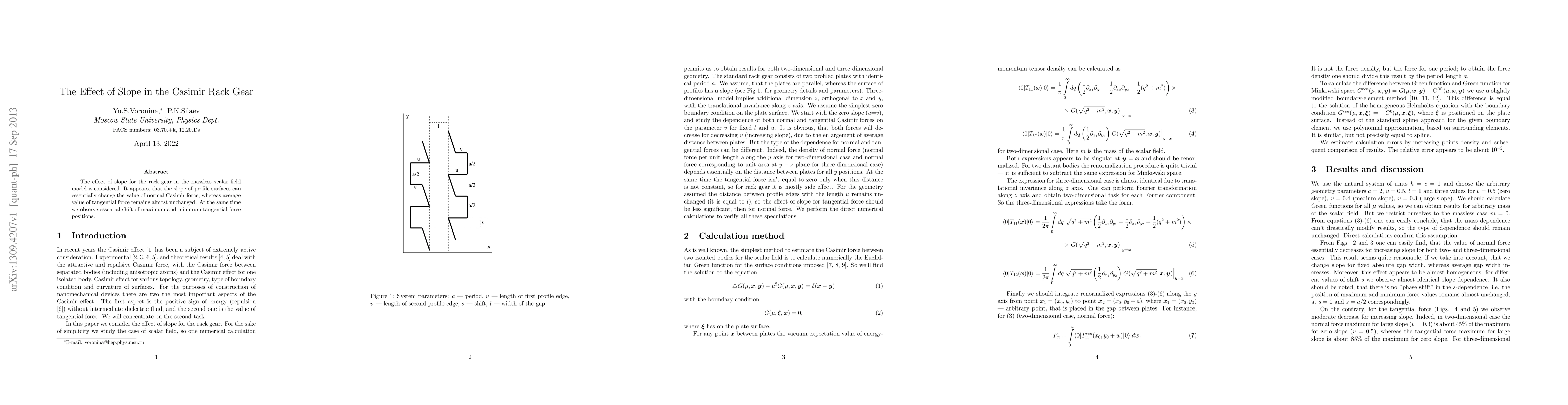 The effect of slope for the rack gear in the massless scalar field model is considered. It appears, that the slope of profile surfaces can essentially change the value of normal Casimir force, whereas average value of tangential force remains almost unchanged. At the same time we observe essential shift of maximum and minimum tangential force positions.