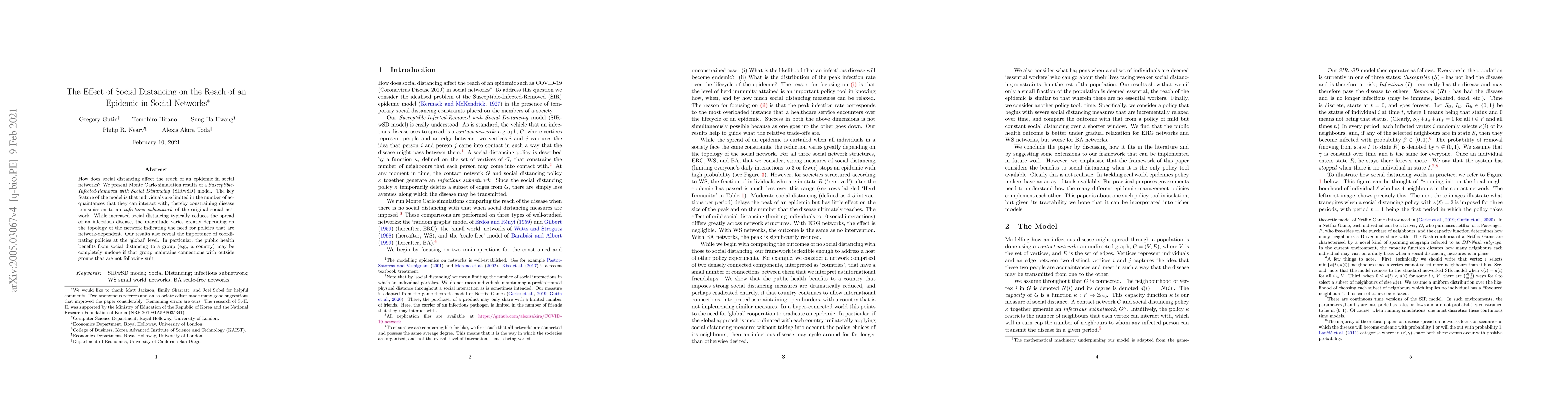 How does social distancing affect the reach of an epidemic in social networks? We present Monte Carlo simulation results of a capacity constrained Susceptible-Infected-Removed (SIR) model. The key modelling feature is that individuals are limited in the number of acquaintances that they can interact with, thereby constraining disease transmission to an infectious subnetwork of the original social network. While increased social distancing always reduces the spread of an infectious disease, the magnitude varies greatly depending on the topology of the network. Our results also reveal the importance of coordinating social distancing policies at the global level. In particular, the public health benefits from social distancing to a group (e.g., a country) may be completely undone if that group maintains connections with outside groups that are not following suit.