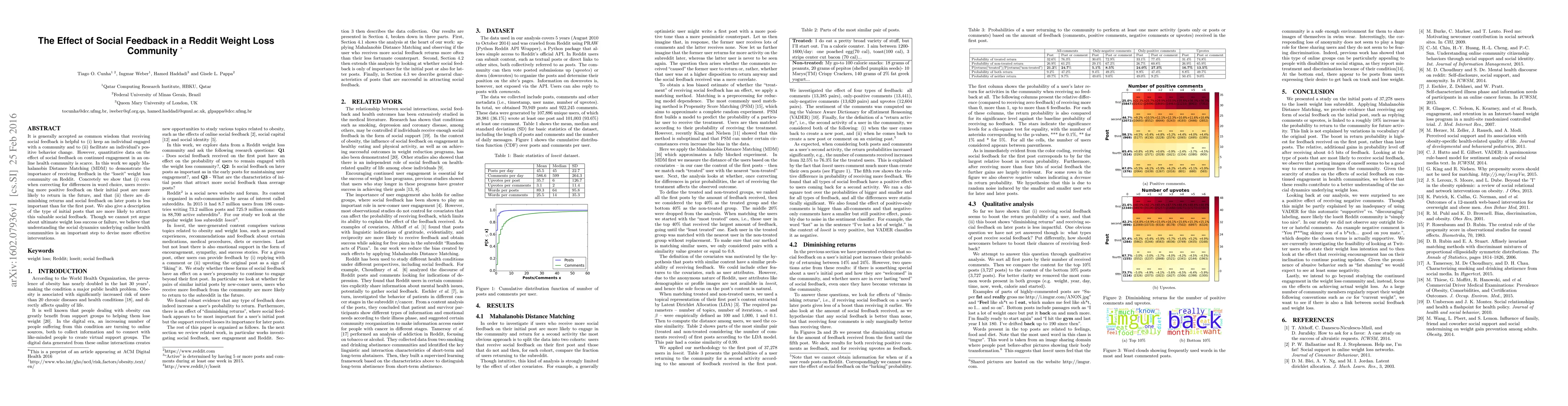 A study on a Reddit weight loss community found that users who received more positive feedback on their initial post were more likely to return, with diminishing returns on later posts. The type of initial posts that attract valuable social feedback were identified as key factors.