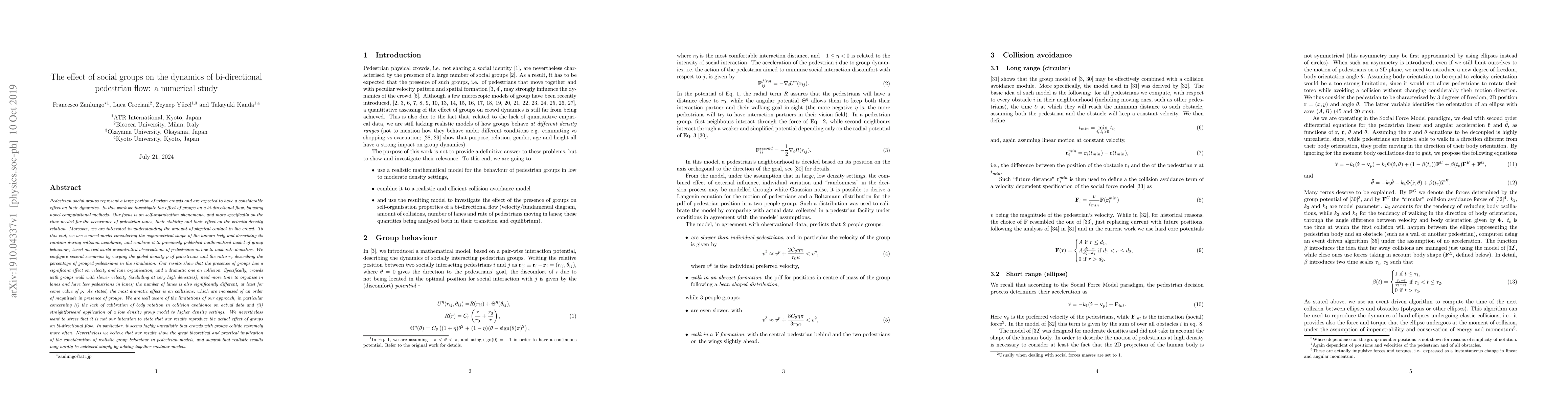 This study uses computational methods to explore how social groups influence bi-directional pedestrian flow dynamics, focusing on self-organization, lane formation, and collision rates. The model incorporates human body rotation during collision avoidance and group behavior, revealing significant impacts on pedestrian velocity and lane stability.