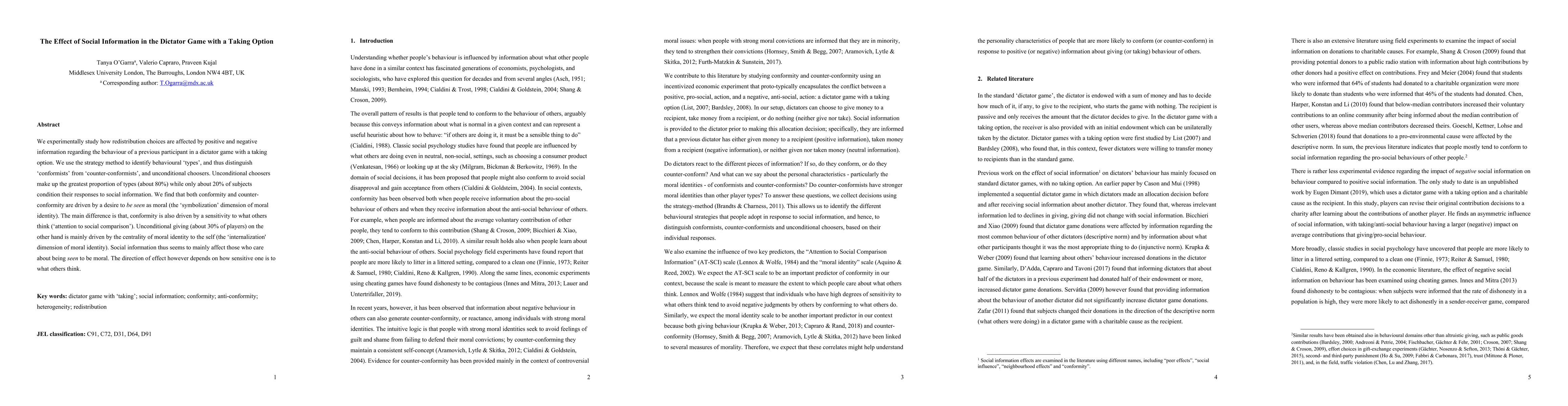 This study investigates how social information influences redistribution choices in a dictator game with a taking option, identifying behavioral "types" like conformists, counter-conformists, and unconditional choosers. It finds that social information mainly affects those motivated by moral identity, with conformity driven by social comparison sensitivity and counter-conformity by moral symbolization.