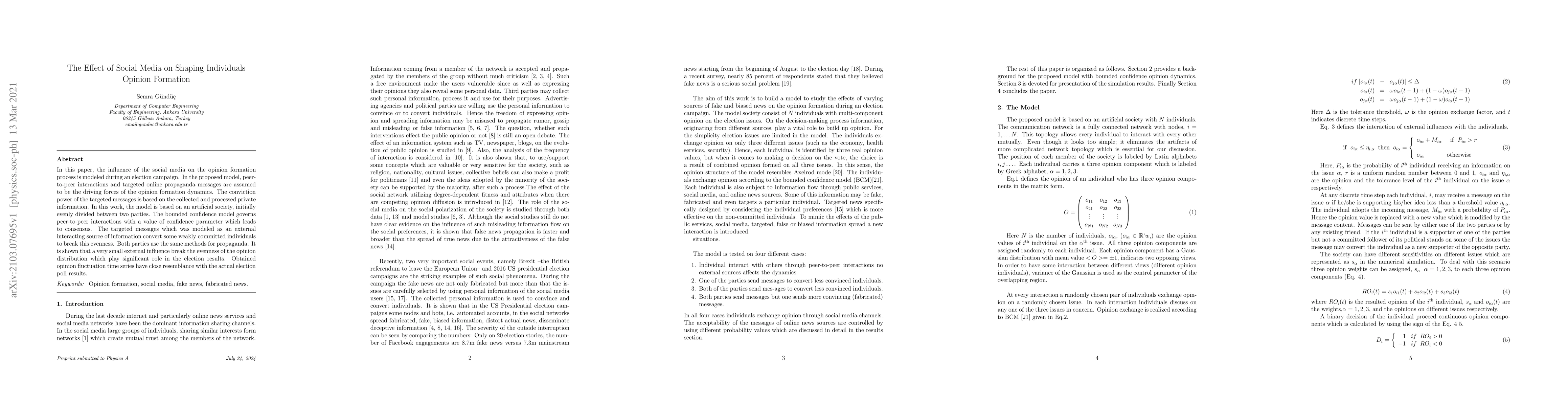 This paper models the influence of social media on opinion formation during an election campaign, highlighting the role of peer-to-peer interactions and targeted propaganda. A small external influence can significantly alter opinion dynamics, leading to a shift in election outcomes, mirroring real-world poll results.