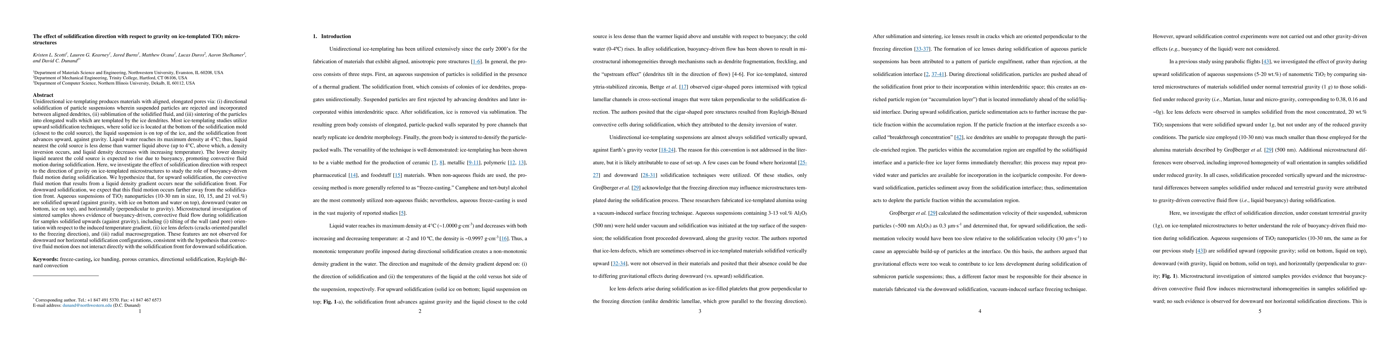 This study investigates how solidification direction relative to gravity affects ice-templated TiO2 microstructures, finding that upward solidification (against gravity) promotes buoyancy-driven convective fluid motion, resulting in distinct microstructural features like tilted walls and ice lens defects, absent in downward or horizontal solidification.