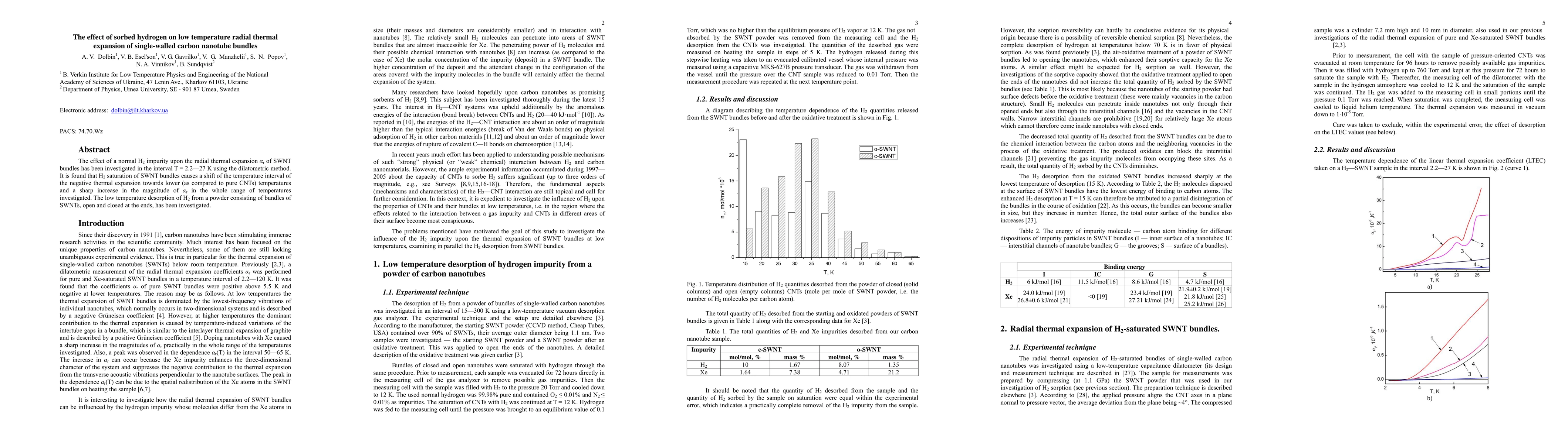 The effect of a normal H2 impurity upon the radial thermal expansion (Ar) of SWNT bundles has been investigated in the interval T = 2.2-27 K using the dilatometric method. It is found that H2 saturation of SWNT bundles causes a shift of the temperature interval of the negative thermal expansion towards lower (as compared to pure CNTs) temperatures and a sharp increase in the magnitude of (Ar) in the whole range of temperatures investigated. The low temperature desorption of H2 from a powder consisting of bundles of SWNTs, open and closed at the ends, has been investigated.