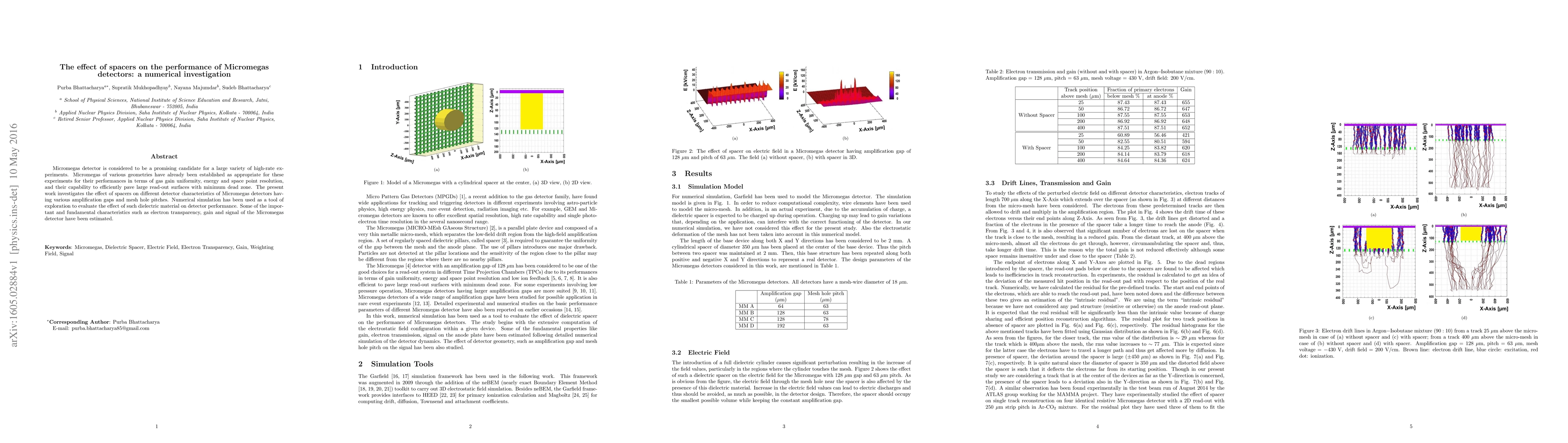 Micromegas detector is considered to be a promising candidate for a large variety of high-rate experiments. Micromegas of various geometries have already been established as appropriate for these experiments for their performances in terms of gas gain uniformity, energy and space point resolution, and their capability to efficiently pave large read-out surfaces with minimum dead zone. The present work investigates the effect of spacers on different detector characteristics of Micromegas detectors having various amplification gaps and mesh hole pitches. Numerical simulation has been used as a tool of exploration to evaluate the effect of such dielectric material on detector performance. Some of the important and fundamental characteristics such as electron transparency, gain and signal of the Micromegas detector have been estimated.