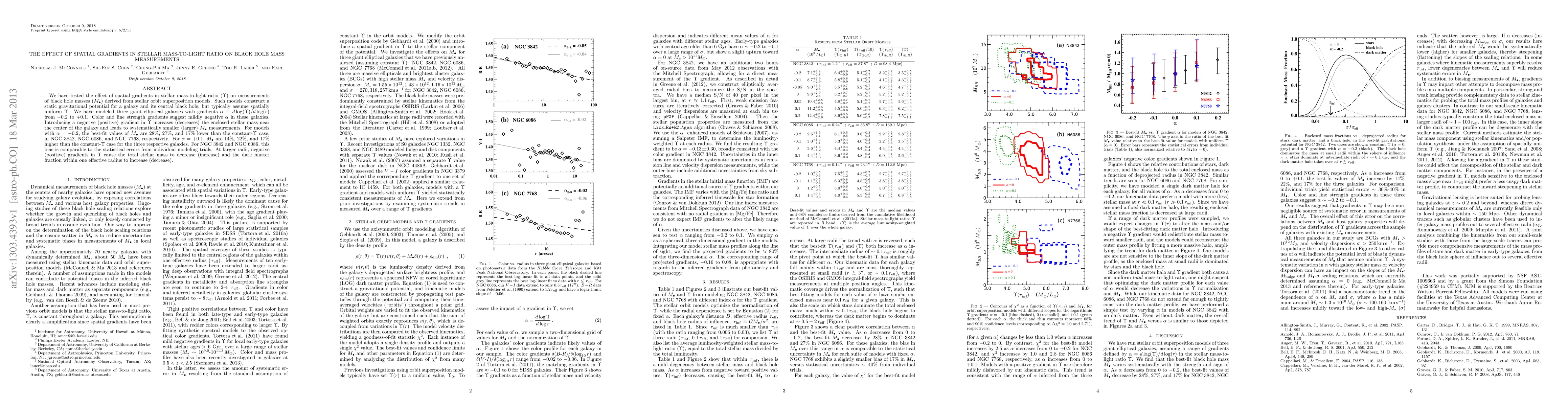 This study investigates how spatial gradients in stellar mass-to-light ratio affect black hole mass measurements derived from stellar orbit models. It finds that negative gradients lead to smaller black hole masses, while positive gradients result in larger masses, with significant deviations in certain galaxies.