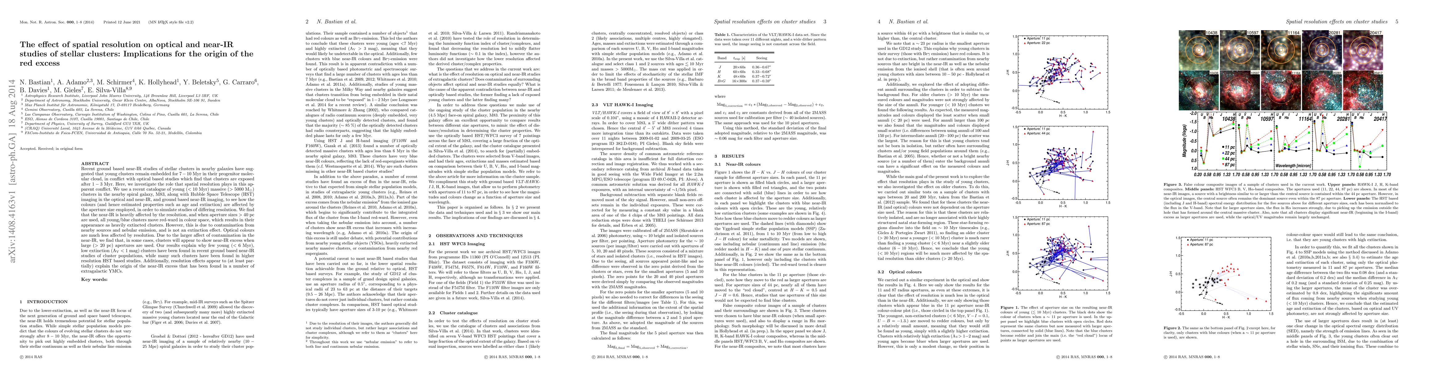 Recent ground based near-IR studies of stellar clusters in nearby galaxies have suggested that young clusters remain embedded for 7-10Myr in their progenitor molecular cloud, in conflict with optical based studies which find that clusters are exposed after 1-3Myr. Here, we investigate the role that spatial resolution plays in this apparent conflict. We use a recent catalogue of young ($<10$~Myr) massive ($>5000$~\msun) clusters in the nearby spiral galaxy, M83, along with Hubble Space Telescope (HST) imaging in the optical and near-IR, and ground based near-IR imaging, to see how the colours (and hence estimated properties such as age and extinction) are affected by the aperture size employed, in order to simulate studies of differing resolution. We find that the near-IR is heavily affected by the resolution, and when aperture sizes $>40$~pc are used, all young/blue clusters move red-ward in colour space, which results in their appearance as heavily extincted clusters. However, this is due to contamination from nearby sources and nebular emission, and is not an extinction effect. Optical colours are much less affected by resolution. Due to the larger affect of contamination in the near-IR, we find that, in some cases, clusters will appear to show near-IR excess when large ($>20$~pc) apertures are used. Our results explain why few young ($<6$~Myr), low extinction ($\av < 1$~mag) clusters have been found in recent ground based near-IR studies of cluster populations, while many such clusters have been found in higher resolution HST based studies. Additionally, resolution effects appear to (at least partially) explain the origin of the near-IR excess that has been found in a number of extragalactic YMCs.