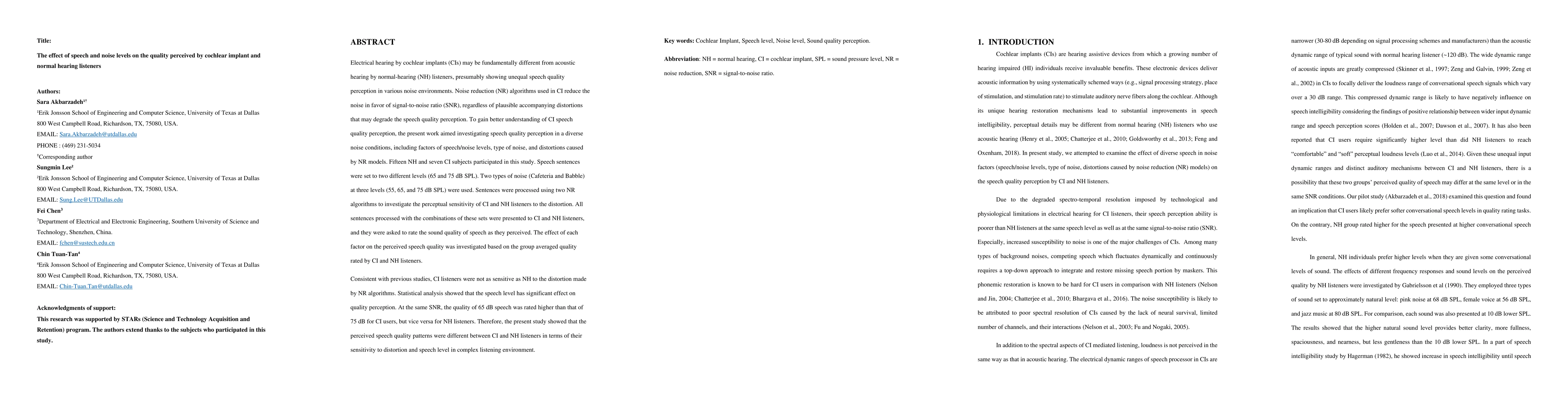 This study investigates how cochlear implant (CI) and normal-hearing (NH) listeners perceive speech quality under varying noise conditions, finding that CI listeners are less sensitive to noise reduction distortions compared to NH listeners. Results show differing sensitivity to speech levels, with CI listeners favoring lower speech levels and NH listeners preferring higher levels.