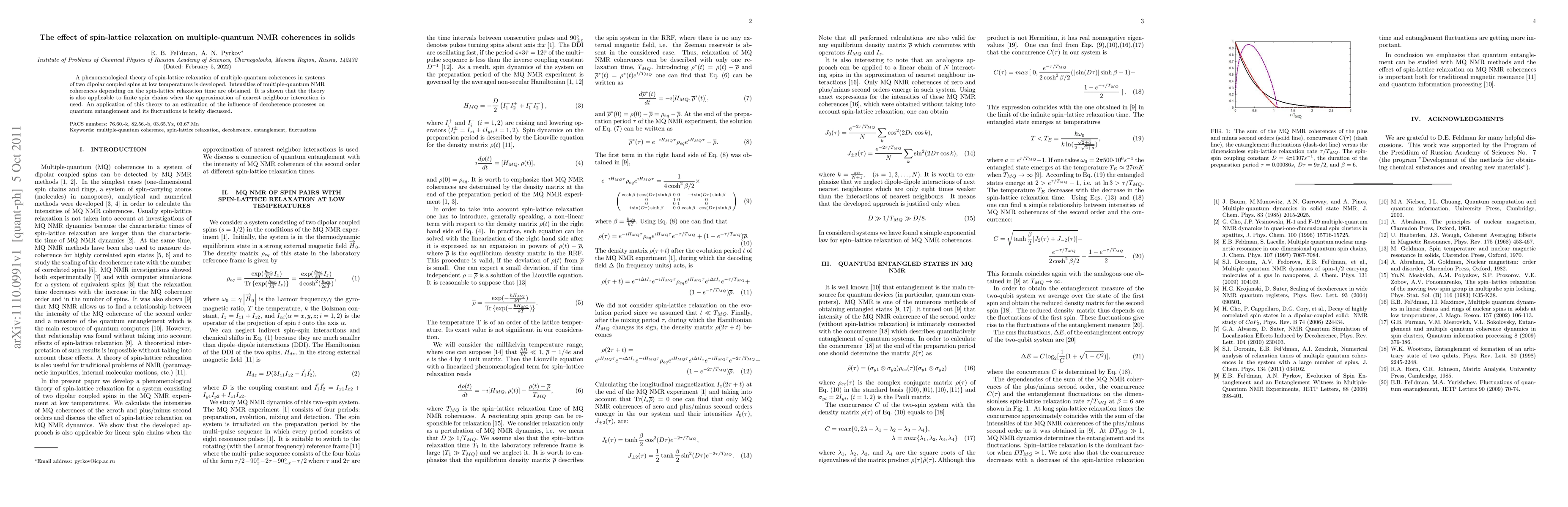 This paper develops a phenomenological theory for spin-lattice relaxation of multiple-quantum NMR coherences in low-temperature systems of two dipolar coupled spins, extending its applicability to finite spin chains. The study also explores the impact of decoherence on quantum entanglement and its fluctuations.