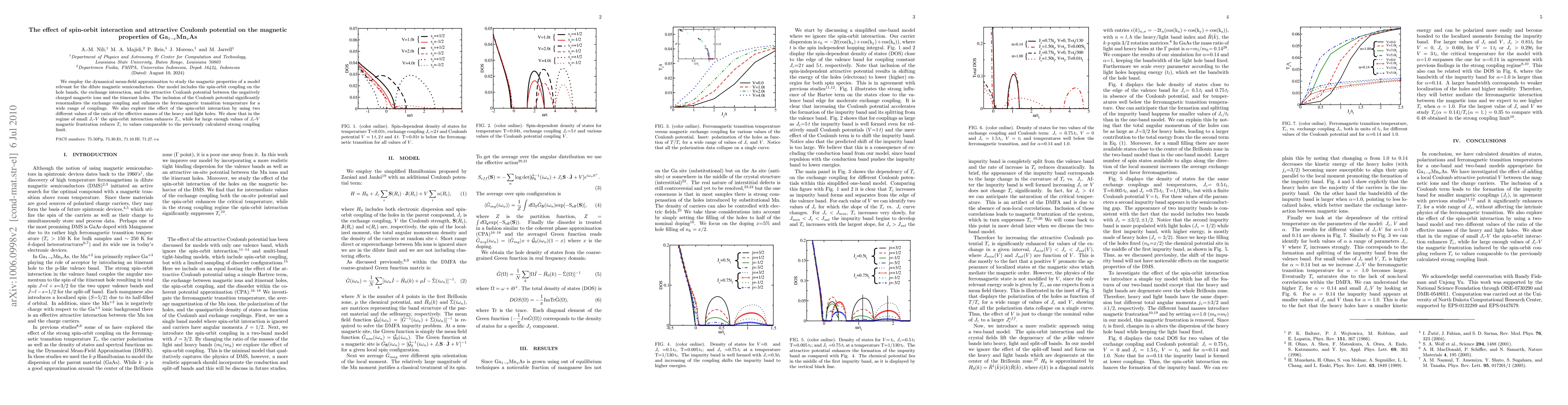 We employ the dynamical mean-field approximation to study the magnetic properties of a model relevant for the dilute magnetic semiconductors. Our model includes the spin-orbit coupling on the hole bands, the exchange interaction, and the attractive Coulomb potential between the negatively charged magnetic ions and the itinerant holes. The inclusion of the Coulomb potential significantly renormalizes the exchange coupling and enhances the ferromagnetic transition temperature for a wide range of couplings. We also explore the effect of the spin-orbit interaction by using two different values of the ratio of the effective masses of the heavy and light holes. We show that in the regime of small $J_{c}$-$V$ the spin-orbit interaction enhances $T_{c}$, while for large enough values of $J_{c}$-$V$ magnetic frustration reduces $T_c$ to values comparable to the previously calculated strong coupling limit.