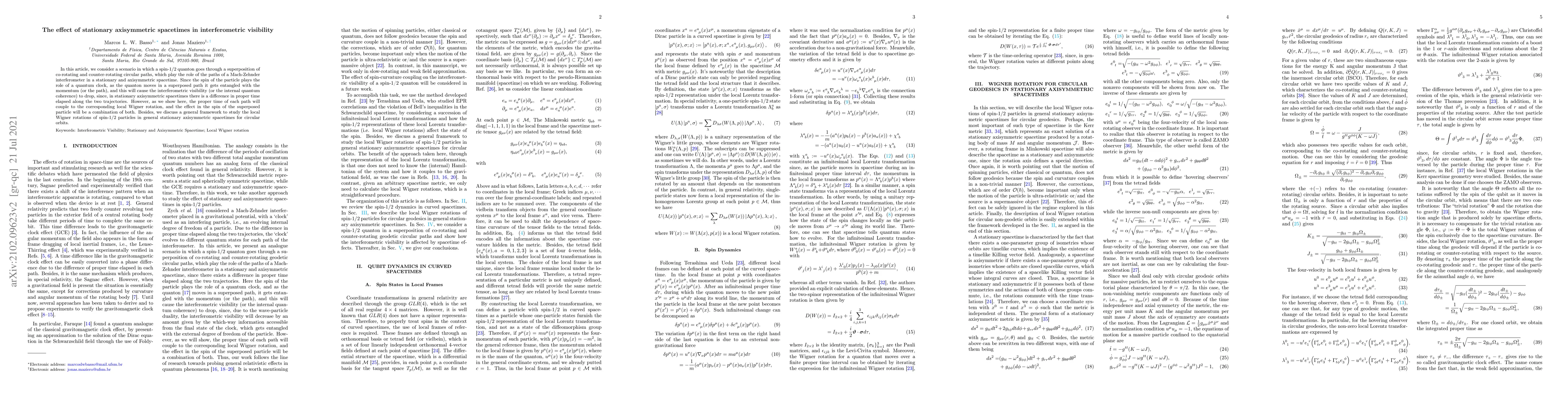 This paper examines how stationary axisymmetric spacetimes affect interferometric visibility in a Mach-Zehnder interferometer modeled by a spin-1/2 quanton on co-rotating and counter-rotating paths. The study reveals that differences in proper time along these paths lead to a drop in interferometric visibility due to entanglement with the particle's momentum, while also introducing a framework for analyzing local Wigner rotations in such spacetimes.