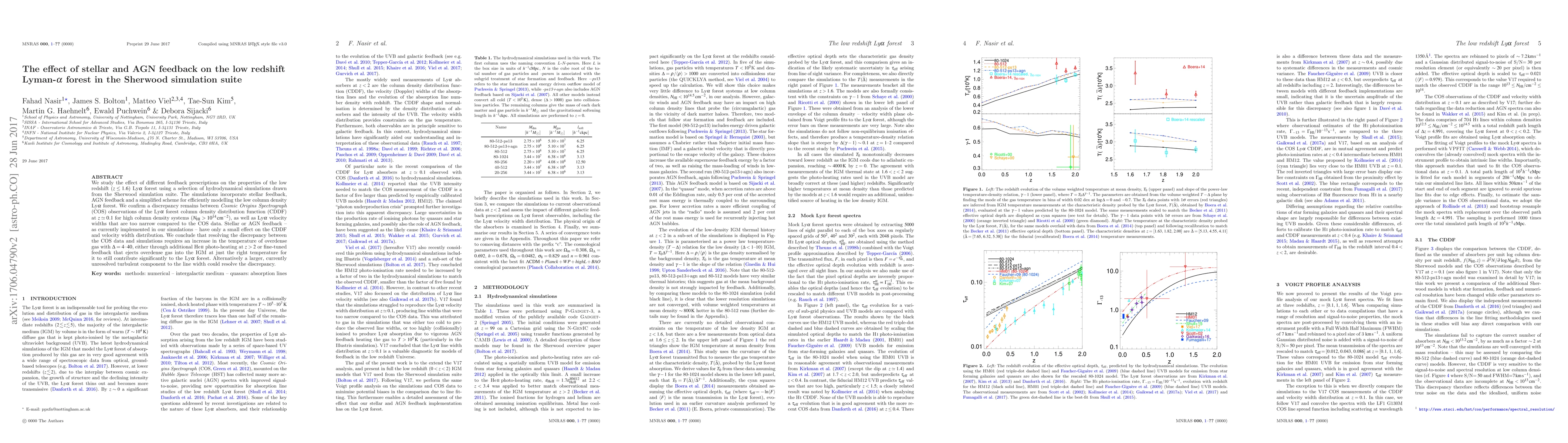 This paper investigates the impact of stellar and AGN feedback on the low redshift ($z\leq1.6$) Lyman-$\alpha$ forest using simulations from the Sherwood suite. It finds that current feedback models have minimal effects on the column density distribution function and velocity widths, which remain inconsistent with COS observations.