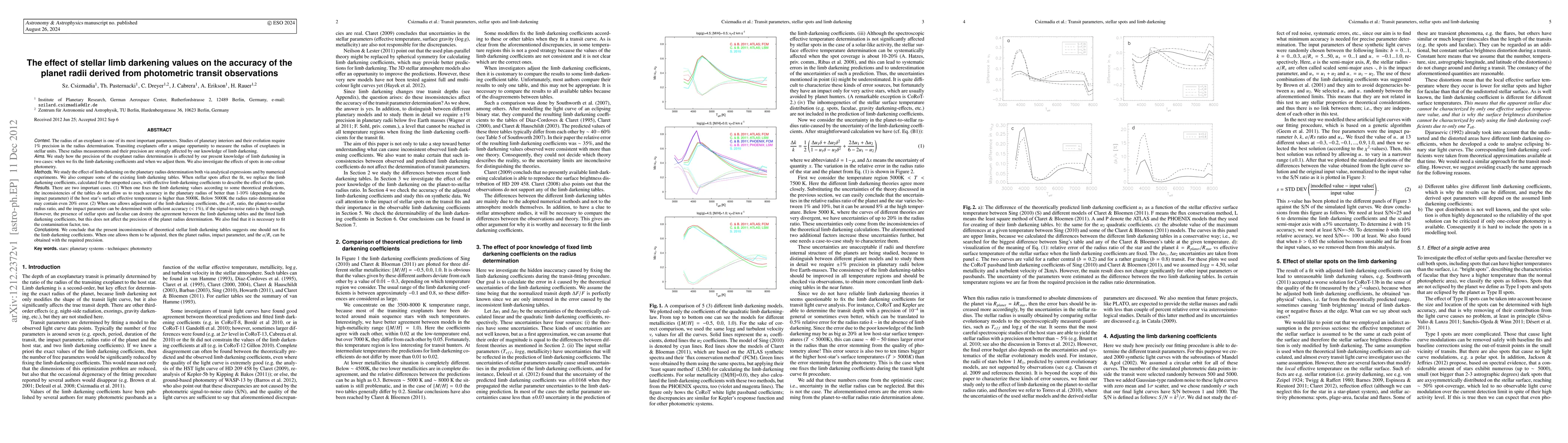 This paper investigates the impact of stellar limb darkening on the accuracy of exoplanet radius determination from photometric transit observations. It finds that fixing limb darkening values leads to errors up to 20%, while adjustable values allow for <1% precision, provided high signal-to-noise ratios, though stellar spots can disrupt the consistency of limb darkening tables.
