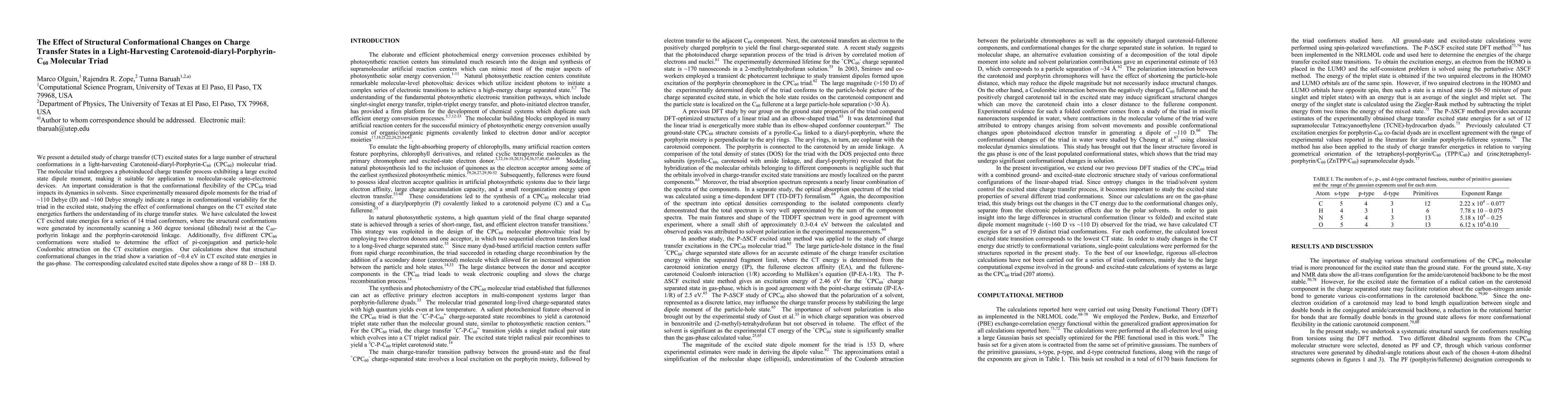 We present a detailed study of charge transfer (CT) excited states for a large number of structural conformations in a light-harvesting Carotenoid-diaryl-Porphyrin-C60 (CPC60) molecular triad. The molecular triad undergoes a photoinduced charge transfer process exhibiting a large excited state dipole moment, making it suitable for application to molecular-scale opto-electronic devices. An important consideration is that the conformational flexibility of the CPC 60 triad impacts its dynamics in solvents. Since experimentally measured dipole moments for the triad of ~110 Debye (D) and ~160 Debye strongly indicate a range in conformational variability for the triad in the excited state, studying the effect of conformational changes on the CT excited state energetics furthers the understanding of its charge transfer states. We have calculated the lowest CT excited state energies for a series of 14 triad conformers, where the structural conformations were generated by incrementally scanning a 360 degree torsional (dihedral) twist at the C60-porhyrin linkage and the porphyrin-carotenoid linkage. Additionally, five different CPC60 conformations were studied to determine the effect of pi-conjugation and particle-hole Coulombic attraction on the CT excitation energies. Our calculations show that structural conformational changes in the triad show a variation of ~0.4 eV in CT excited state energies in the gas-phase. The corresponding calculated excited state dipoles show a range of 88 D - 188 D.