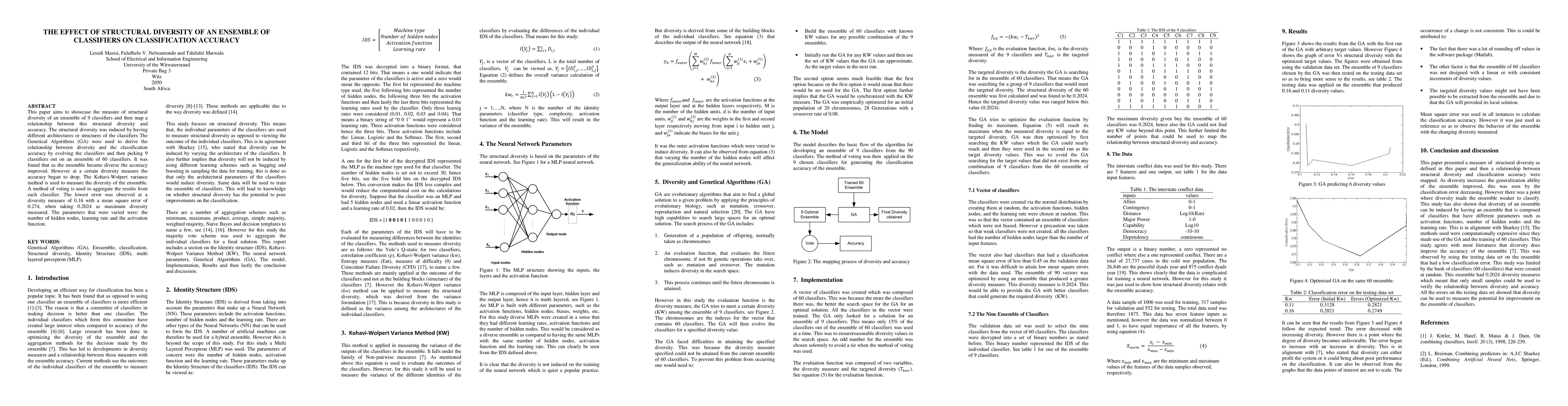 This paper investigates how structural diversity among 9 classifiers in an ensemble affects classification accuracy, finding that diversity initially boosts accuracy but beyond a point, accuracy declines. The study uses Genetic Algorithms to evolve classifiers and employs the Kohavi-Wolpert variance method to measure diversity, concluding that the lowest error occurs at a diversity measure of 0.16.