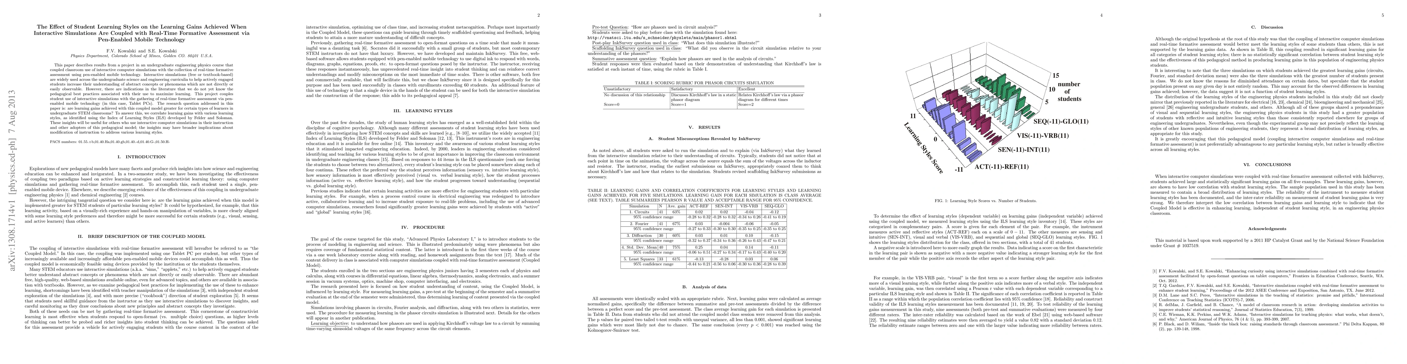 This study investigates whether interactive simulations paired with real-time formative assessment via pen-enabled mobile technology yield greater learning gains for specific student learning styles in undergraduate STEM courses. The results, correlated with the Index of Learning Styles, provide insights into optimizing instructional methods for different learners.