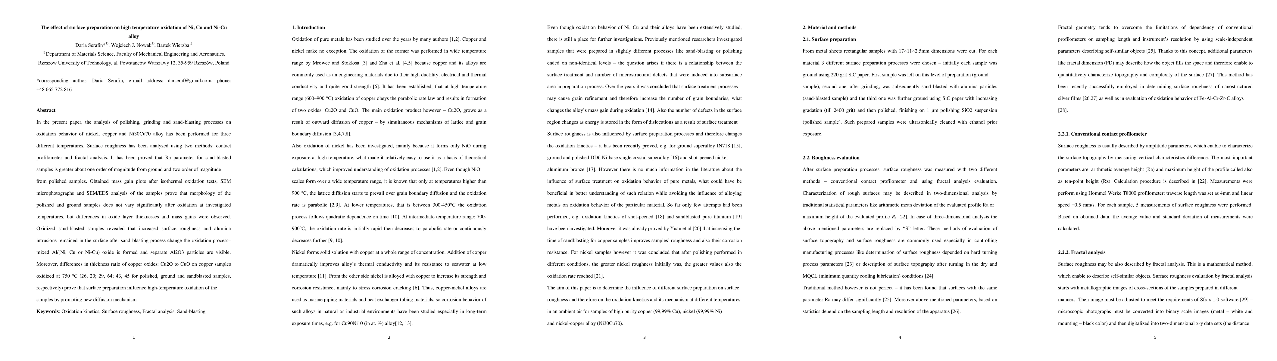In the present paper, the analysis of polishing, grinding and sand-blasting processes on oxidation behavior of nickel, copper and nickel-copper alloy has been investigated. Surface roughness has been measured using two methods: by contact profilometer and by fractal analysis. It has been proved that sand-blasting process influences the surface roughness the most but also contaminates the surface with alumina particles. The oxidation tests were performed in thermogravimetrical furnace. The obtained mass gain plots, SEM microphotographs of cross-sections and SEM EDS analysis of the samples prove that surface preparation changes oxidation kinetics morphology of the polished and ground samples does not vary significantly after oxidation at investigated temperatures, but differences in oxide layer thicknesses and mass gains were observed. Oxidized sandblasted samples reveal that increased surface roughness and alumina intrusions change the oxidation process mixed Al (Ni, Cu or Ni-Cu) oxide is formed and separate Al2O3 particles are visible. The results prove that surface preparation influence high temperature oxidation of the samples by promoting new diffusion mechanism.