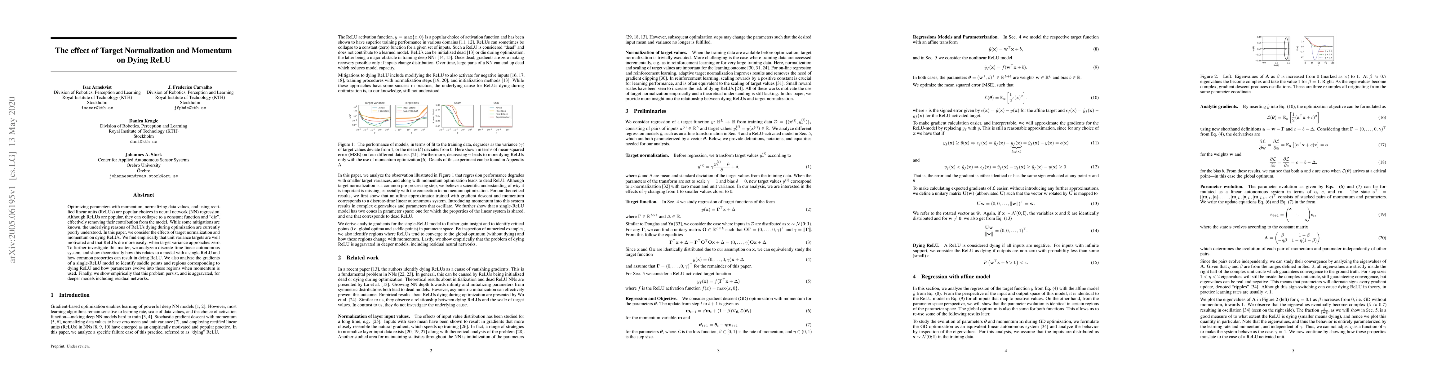Optimizing parameters with momentum, normalizing data values, and using rectified linear units (ReLUs) are popular choices in neural network (NN) regression. Although ReLUs are popular, they can collapse to a constant function and "die", effectively removing their contribution from the model. While some mitigations are known, the underlying reasons of ReLUs dying during optimization are currently poorly understood. In this paper, we consider the effects of target normalization and momentum on dying ReLUs. We find empirically that unit variance targets are well motivated and that ReLUs die more easily, when target variance approaches zero. To further investigate this matter, we analyze a discrete-time linear autonomous system, and show theoretically how this relates to a model with a single ReLU and how common properties can result in dying ReLU. We also analyze the gradients of a single-ReLU model to identify saddle points and regions corresponding to dying ReLU and how parameters evolve into these regions when momentum is used. Finally, we show empirically that this problem persist, and is aggravated, for deeper models including residual networks.