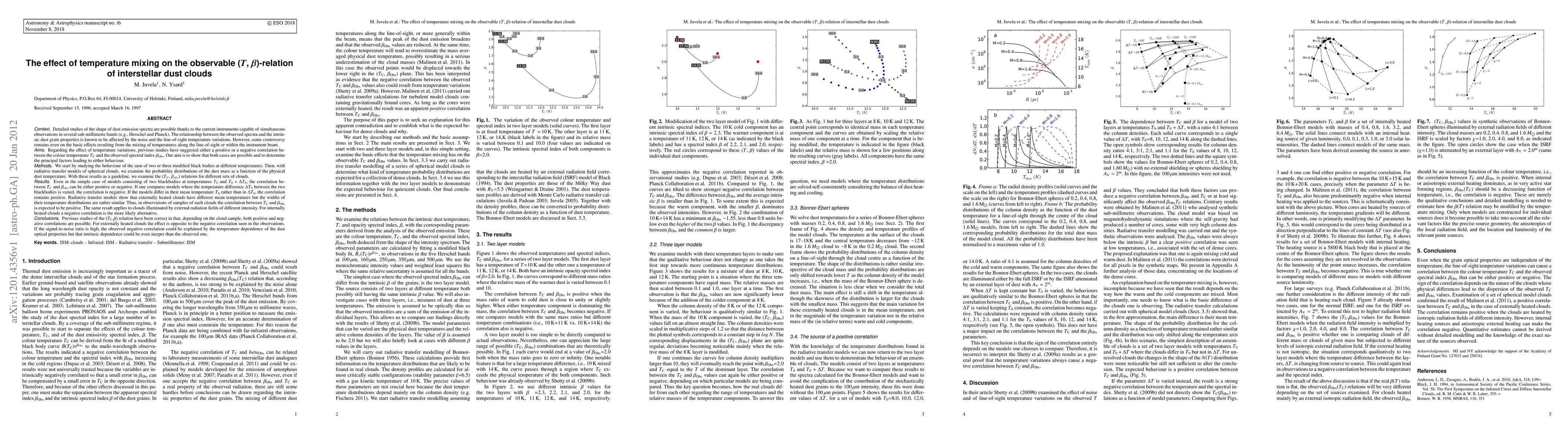 This paper investigates the correlation between colour temperature (T_C) and observed spectral index (beta_Obs) in interstellar dust clouds, finding that the correlation can be either positive or negative depending on the temperature mixing along the line-of-sight. Radiative transfer models reveal that the correlation is positive for clouds with varying mean temperatures and negative for those with varying temperature differences.