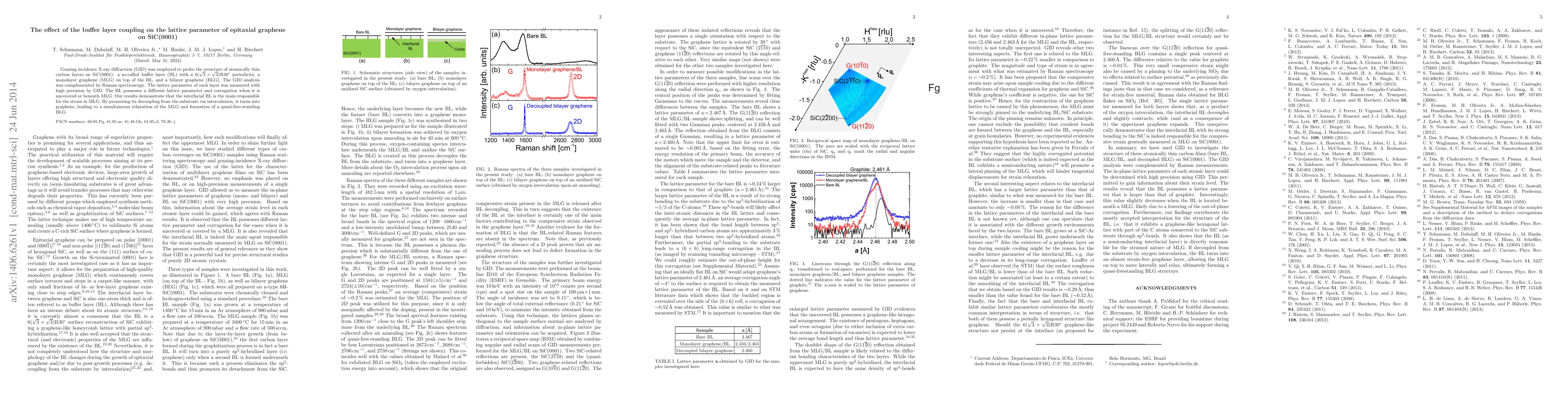 Grazing incidence X-ray diffraction (GID) was employed to probe the structure of atomically thin carbon layers on SiC(0001): a so-called buffer layer (BL) with a $6(\sqrt{3}\times\sqrt{3})$R30$^\circ$ periodicity, a monolayer graphene (MLG) on top of the BL, and a bilayer graphene (BLG). The GID analysis was complemented by Raman spectroscopy. The lattice parameter of each layer was measured with high precision by GID. The BL possesses a different lattice parameter and corrugation when it is uncovered or beneath MLG. Our results demonstrate that the interfacial BL is the main responsible for the strain in MLG. By promoting its decoupling from the substrate via intercalation, it turns into graphene, leading to a simultaneous relaxation of the MLG and formation of a quasi-free-standing BLG.