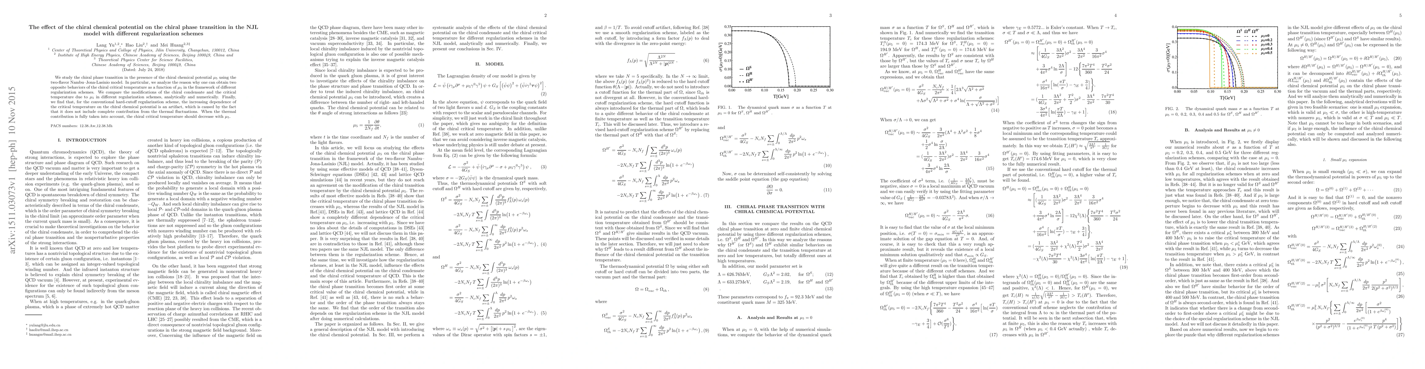 We study the chiral phase transition in the presence of the chiral chemical potential $\mu_5$ using the two-flavor Nambu--Jona-Lasinio model. In particular, we analyze the reason why one can obtain two opposite behaviors of the chiral critical temperature as a function of $\mu_5$ in the framework of different regularization schemes. We compare the modifications of the chiral condensate and the critical temperature due to $\mu_5$ in different regularization schemes, analytically and numerically. Finally, we find that, for the conventional hard-cutoff regularization scheme, the increasing dependence of the critical temperature on the chiral chemical potential is an artifact, which is caused by the fact that it does not include complete contribution from the thermal fluctuations. When the thermal contribution is fully taken into account, the chiral critical temperature should decrease with $\mu_5$.