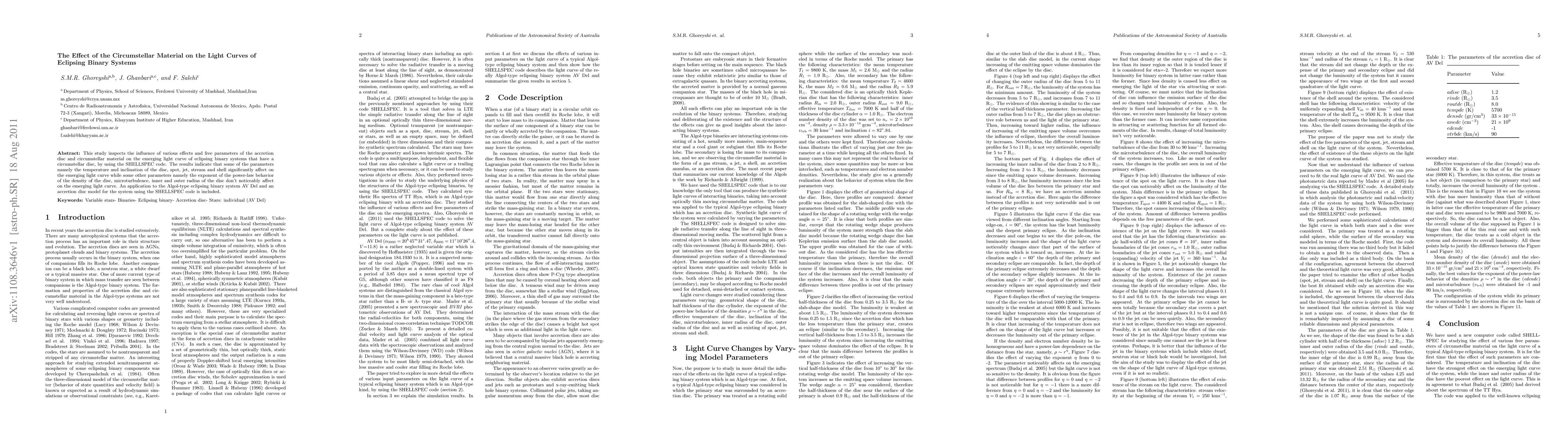 This study inspects the influence of various effects and free parameters of the accretion disc and circumstellar material on the emerging light curve of eclipsing binary systems that have a circumstellar disc, by using the SHELLSPEC code. The results indicate that some of the parameters namely the temperature and inclination of the disc, spot, jet, stream and shell significantly affect on the emerging light curve while some other parameters namely the exponent of the power-law behavior of the density of the disc, microturbulence, inner and outer radius of the disc don't noticeably affect on the emerging light curve. An application to the Algol-type eclipsing binary system AV Del and an accretion disc model for the system using the SHELLSPEC code is included.