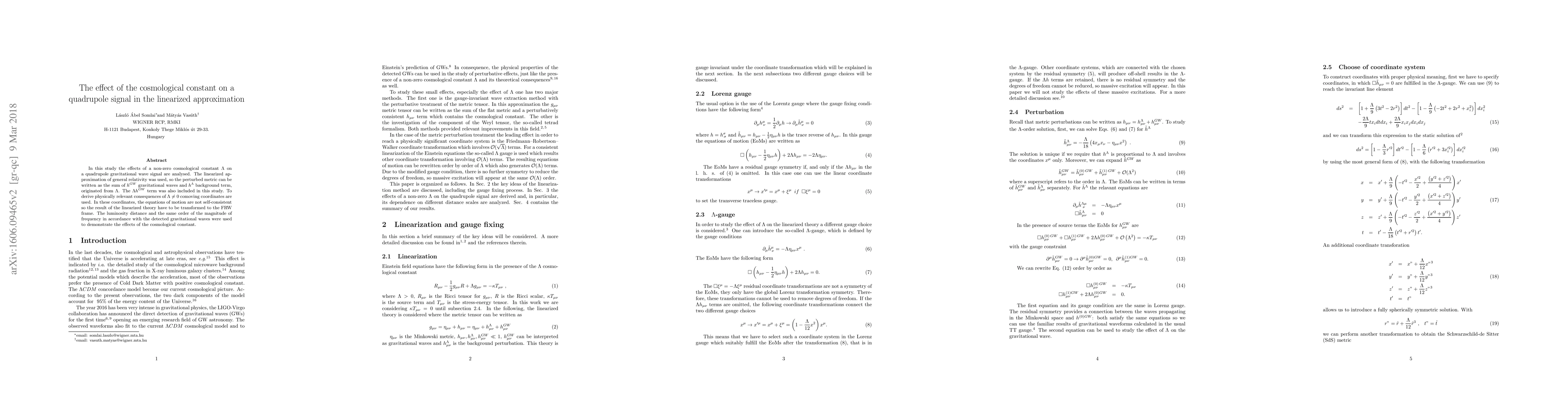 In this study the effects of a non-zero cosmological constant $\Lambda$ on a quadrupole signal are studied. The linearized approximation of general relativity was used, so the metric can be written as $g_{\mu\nu}=\eta_{\mu\nu}+h_{\mu\nu}=\eta_{\mu\nu}+h_{\mu\nu}^{\Lambda}+h_{\mu\nu}^{GW}$ where $h_{\mu\nu}^{GW}$ can be interpreted as gravitational waves and $h_{\mu\nu}^{\Lambda}$ is the background perturbation. The $\Lambda h^{GW}$ term was also included in this study. To derive physically relevant consequences of $\Lambda\neq0$, the Friedmann--Robertson--Walker comoving coordinates are used. In these coordinates, the equations of motion are not self-consistent so the result of the linearized theory have to be transformed to the FRW metric. The luminosity distance and the same order of the magnitude of frequency of the GW150914 was used for the results.