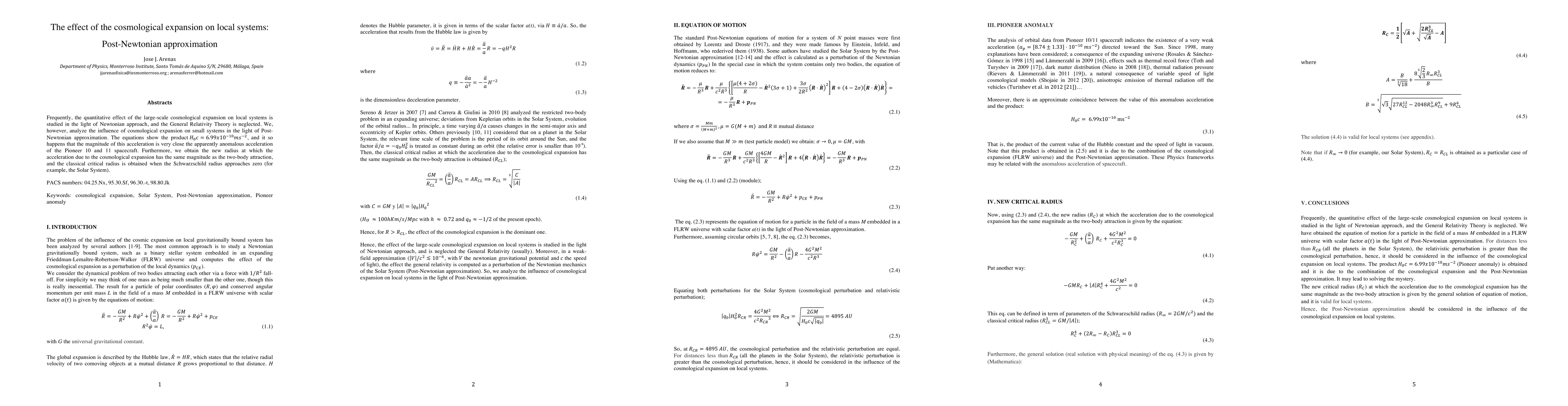 This paper examines the impact of cosmological expansion on local systems using the Post-Newtonian approximation, revealing an acceleration product Hc=6.99*10^-10 ms^-2 that closely matches the anomalous acceleration of Pioneer 10 and 11. It also identifies a new critical radius where cosmological expansion equals two-body attraction, with the classical critical radius emerging as the Schwarzschild radius approaches zero.