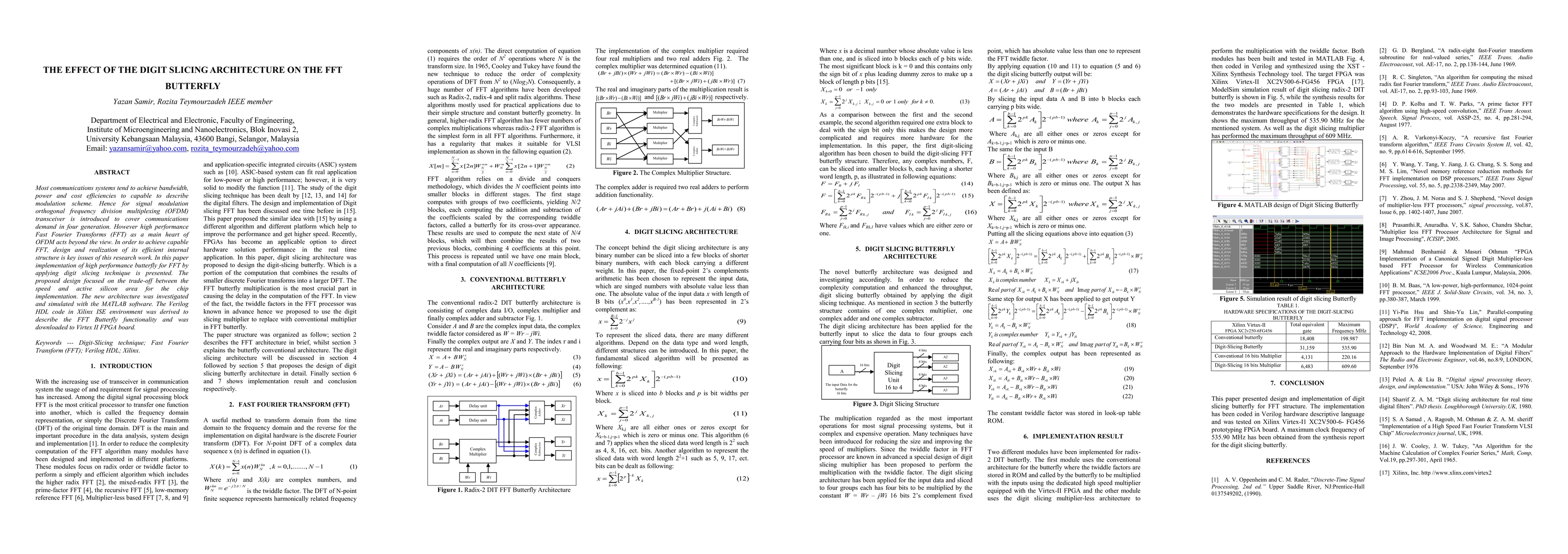 This paper presents an efficient FFT butterfly implementation using digit slicing architecture to enhance performance in OFDM-based communication systems. The proposed design balances speed and silicon area, validated through MATLAB simulations and FPGA implementation on a Virtex II board.