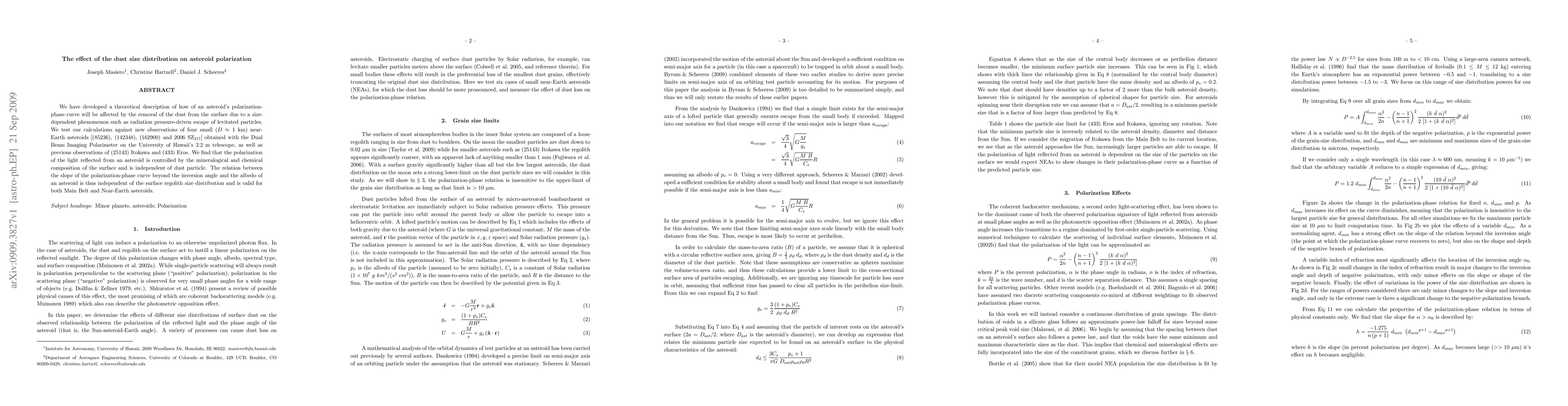 We have developed a theoretical description of how of an asteroid's polarization-phase curve will be affected by the removal of the dust from the surface due to a size-dependent phenomenon such as radiation pressure-driven escape of levitated particles. We test our calculations against new observations of four small (D ~ 1 km) near-Earth asteroids [(85236), (142348), (162900) and 2006 SZ_217] obtained with the Dual Beam Imaging Polarimeter on the University of Hawaii's 2.2 m telescope, as well as previous observations of (25143) Itokawa and (433) Eros. We find that the polarization of the light reflected from an asteroid is controlled by the mineralogical and chemical composition of the surface and is independent of dust particle. The relation between the slope of the polarization-phase curve beyond the inversion angle and the albedo of an asteroid is thus independent of the surface regolith size distribution and is valid for both Main Belt and Near-Earth asteroids.
