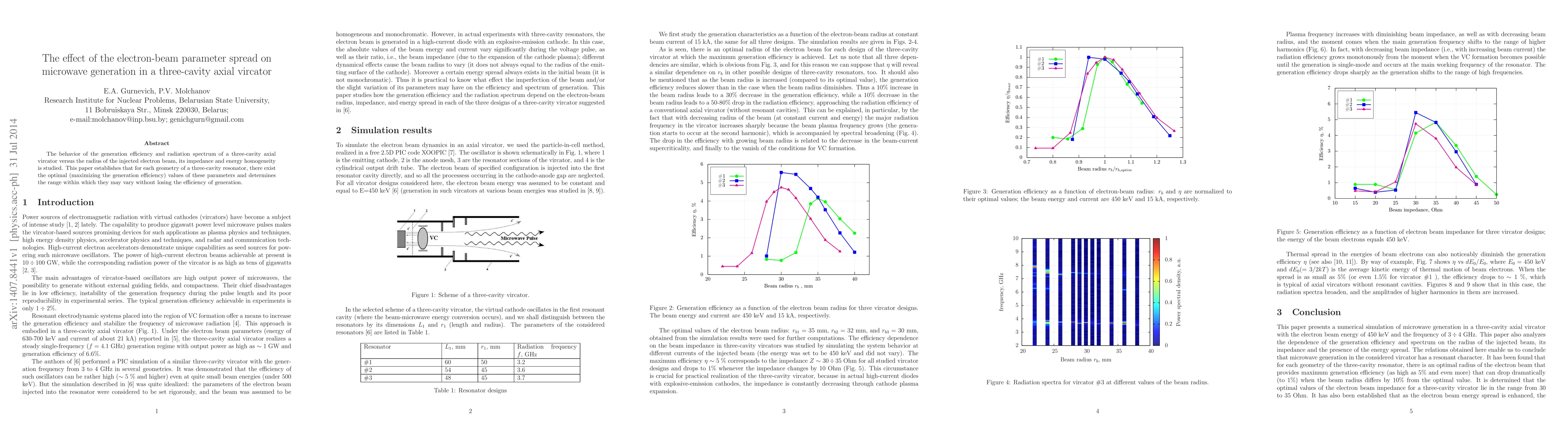 This paper investigates the impact of electron-beam parameter spread on microwave generation in a three-cavity axial vircator. It identifies optimal values for the electron beam's radius, impedance, and energy homogeneity that maximize generation efficiency and determines the permissible range for these parameters to maintain efficiency.