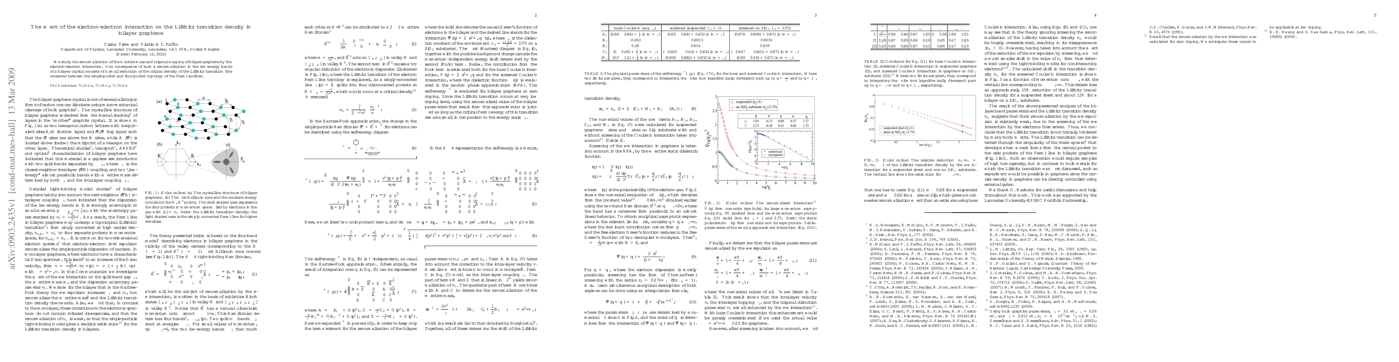 This study investigates how electron-electron interactions affect the effective mass and trigonal warping in bilayer graphene, leading to a slight reduction in the critical density for the Lifshitz transition, which marks the shift from a single-pocket to a four-pocket Fermi surface topology.