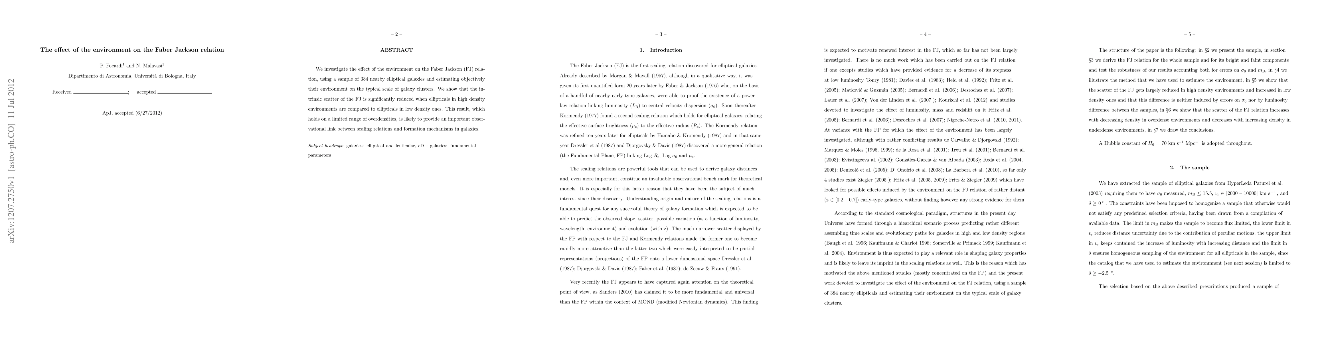 We investigate the effect of the environment on the Faber Jackson (FJ) relation, using a sample of 384 nearby elliptical galaxies and estimating objectively their environment on the typical scale of galaxy clusters. We show that the intrinsic scatter of the FJ is significantly reduced when ellipticals in high density environments are compared to ellipticals in low density ones. This result, which holds on a limited range of overdensities, is likely to provide an important observational link between scaling relations and formation mechanisms in galaxies.