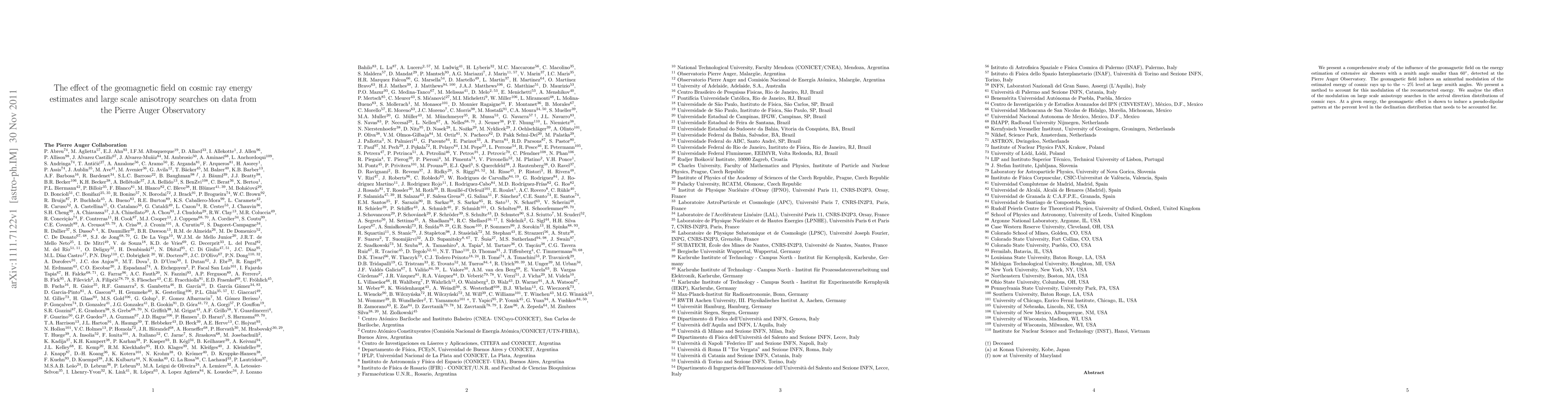 This study investigates the geomagnetic field's impact on cosmic ray energy estimates and large-scale anisotropy searches at the Pierre Auger Observatory, revealing a ~2% azimuthal modulation in energy estimates at large zenith angles. A method is developed to correct for this modulation, which also induces a pseudo-dipolar pattern at the percent level in the declination distribution, affecting anisotropy analyses.