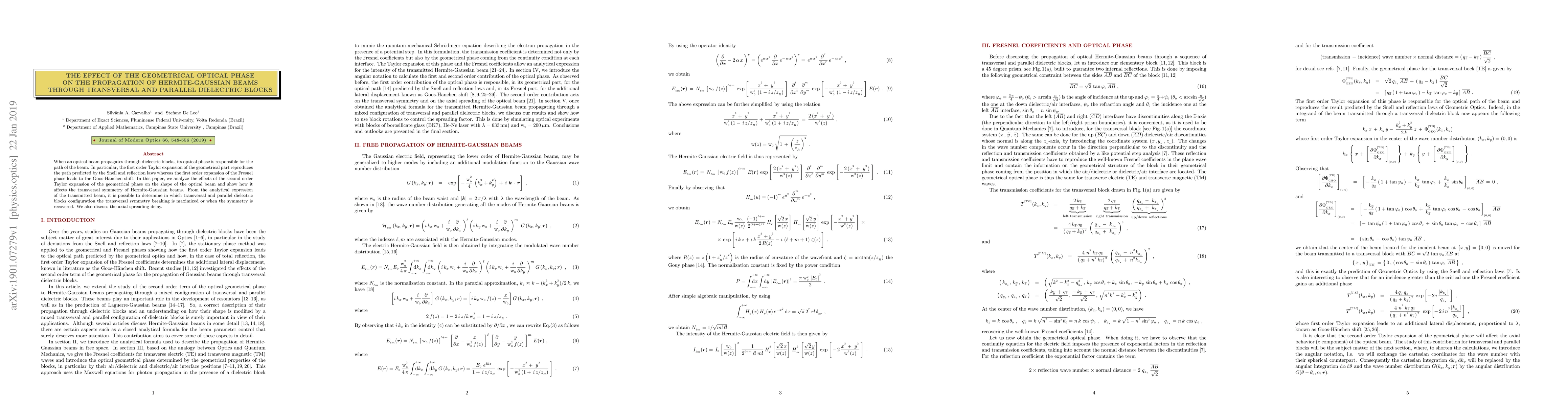 The paper investigates how a beam's optical phase affects its propagation through dielectric blocks, with a focus on Hermite-Gaussian beams, and finds that the second-order expansion of geometrical phase can break transversal symmetry, leading to axial spreading.